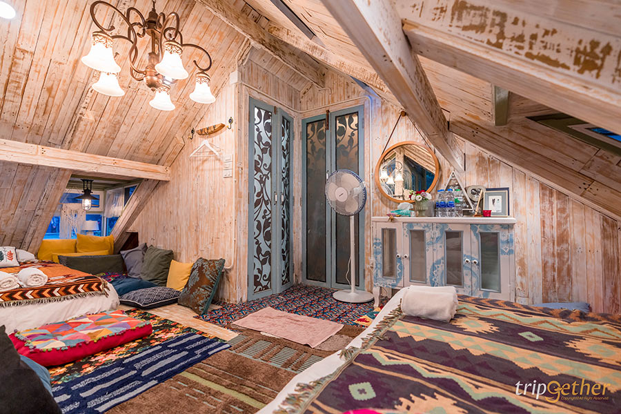 อีกห้องหนึ่งที่อยู่บนชั้นใต้หลังคา ถ่ายรูปมาให้ฟีลเหมือนอยู่ทางยุโรป ห้องดอกกำปอง(A6) เหมาะสำหรับกลุ่มเพื่อน ที่ต้องการพักรวมกัน ด้วยห้องที่มีขนาดใหญ่สำหรับ 5 คน หลับสบายกับเตียงควีนไซส์ 2 หลังและเตียงเล็กอีก 1 หลัง ถึงแม้จะมีพื้นที่อย่างจำกัด แต่ทางที่พักก็สามารถใช้พื้นที่ได้อย่างคุ้มค่า ทำให้ห้องนอนสำหรับ 5 คนนี้ไม่ได้ดูแคบไปเลย ใครที่ฝันอยากนอนห้องใต้หลังคา ต้องมาลองพักสักคืน แล้วจะรู้เลยว่ามันสบายมาก
