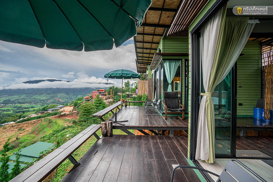 พื้นที่ระเบียงส่วนตัวขนาดใหญ่ด้านหน้าห้องถูกกั้นด้วยระแนงไม้ไผ่ระหว่างห้องเพื่อความเป็นส่วนตัวของผู้เข้าพักและยังมองเห็นวิวอ่างเก็บน้ำรัตนัยซึ่งเป็นจุดกำเนิดหมอกของเขาค้อได้อย่างชัดเจน