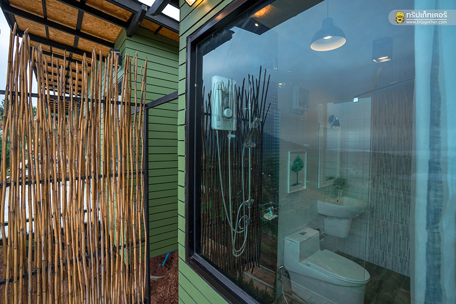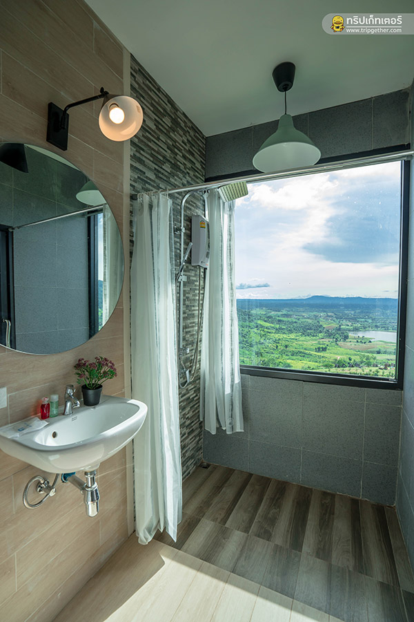 ห้องน้ำถูกออกแบบให้มีกระจกใสบานใหญ่เพื่อเพิ่มอรรถรสให้แก่ผู้เข้าพักให้รู้สึกได้ใกล้ชิดกับธรรมชาติราวกับอาบน้ำท่ามกลางทะเลหมอก