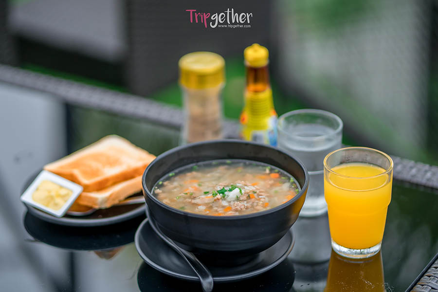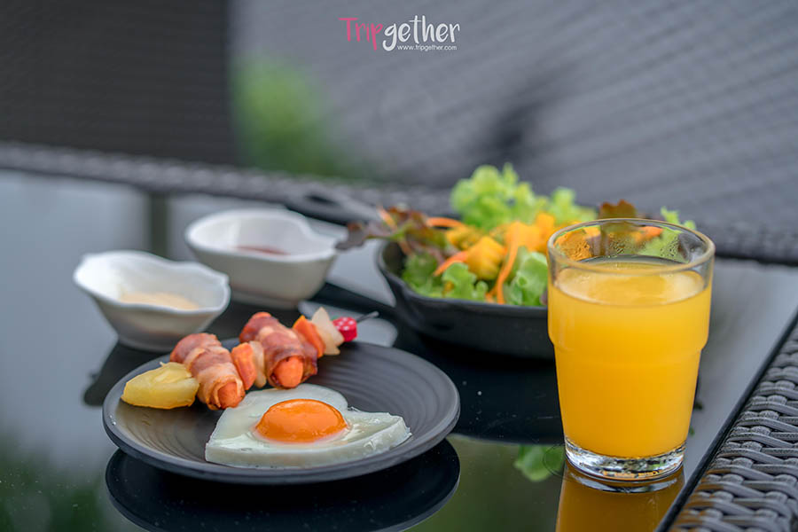 ตื่นเช้ามาสูดอากาศฟินๆ พร้อมรับประทานอาหารเช้ากันที่ห้องอาหาร ซึ่งจะอยู่ด้านบน เปิดให้บริการตั้งแต่ 7 โมงเช้าถึง 9 โมงกันเลย เสริฟมาแบบเป็นเซ็ต มีทั้งอเมริกันเบรคฟาสต์ สลัด ข้าวต้ม แถมยังมีมินิบาร์ขนมปัง ชา กาแฟ ให้รับประทานกันแบบไม่อั้นอีกด้วย