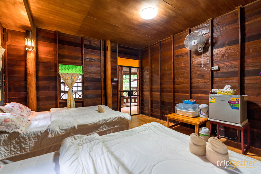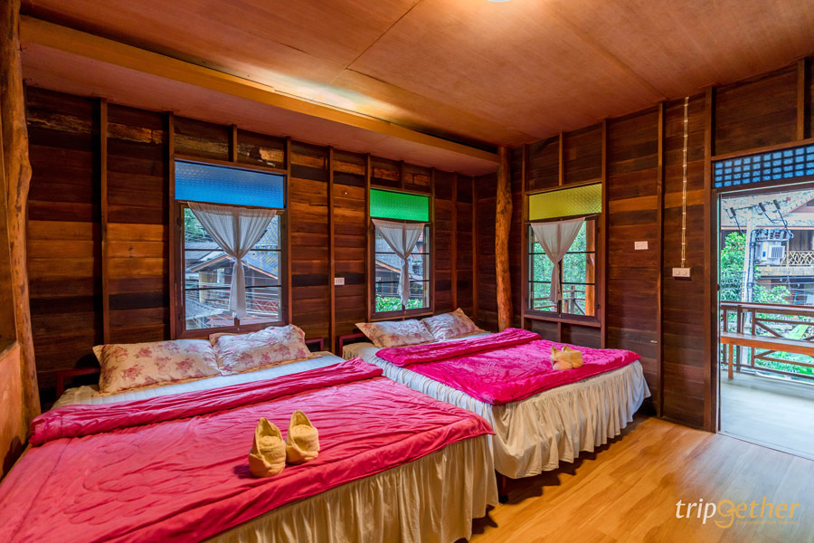 มาต่อกันที่โฮมสเตย์หลังที่ 2 เป็นห้องพักที่สุดอบอุ่น เหมาะแก่การมาพักผ่อนกับครอบครัว หรือใช้เวลาร่วมกับแก๊งเพื่อน เพราะโฮมสเตย์หลังนี้รองรับผู้เข้าพักได้ได้ตั้งแต่ 4 – 8 คนเลยทีเดียว ไฮไลท์ของโฮมสเตย์หลังนี้คือทำเลที่ตั้งอยู่ติดกับเส้นทางของหมู่บ้าน พร้อมกับระเบียงที่ออกแบบมาให้ได้ทุกคนได้นั่งชิลล์ มองบรรยากาศของผู้คน หมู่บ้าน หรือจะนั่งกินอาหารแบบสบายๆ พร้อมกับกินบรรยากาศชุมชนไปก็ได้