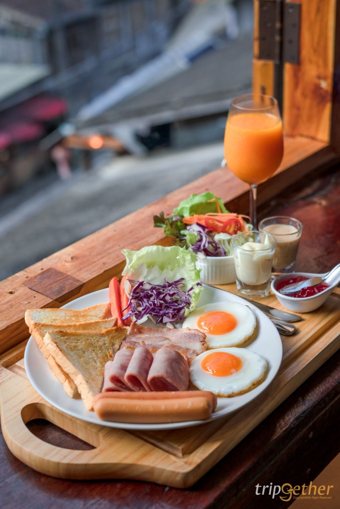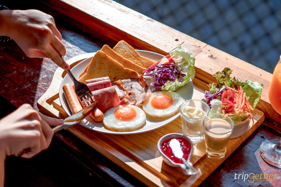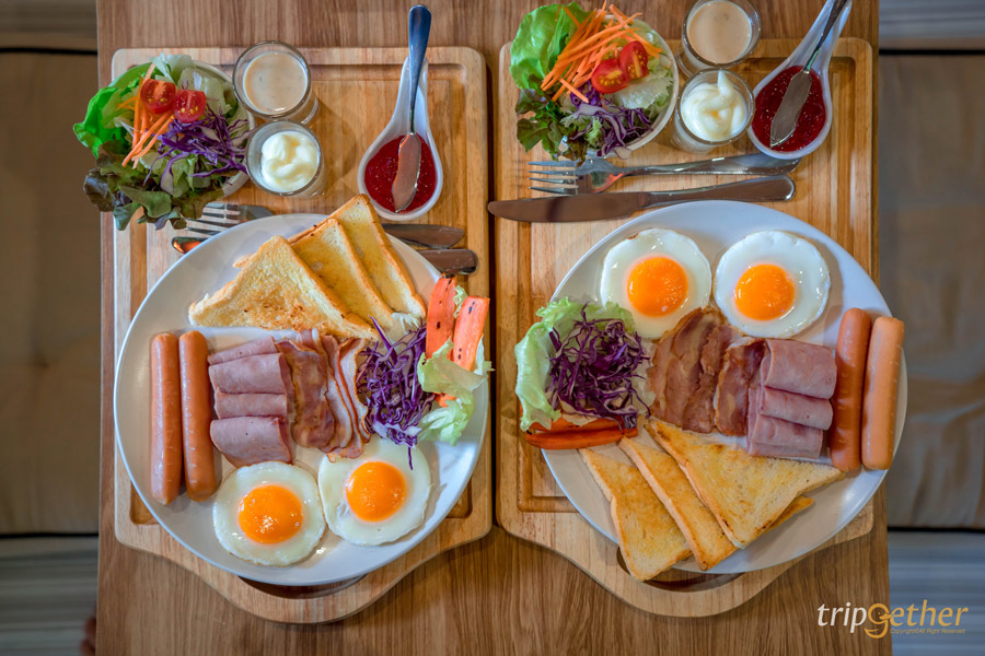 ไข่ดาวน่ารักๆ ไส้กรอกร้อนๆ เบค่อน และแฮมที่หอมฉุย เสิร์ฟพร้อมกับสลัดผักสดๆ ขนมปัง และน้ำส้ม เป็นเมนูเซ็ตอาหารเช้าของแม่กำปองป้ายแดงพรีเมียม&โฮมสเตย์ ที่มาบริการให้พร้อมถึงห้องพักพรีเมียม บรรยากาศตอนเช้าๆ กับเมนูแสนอร่อย ฟีลกู๊ดเลยแหละ