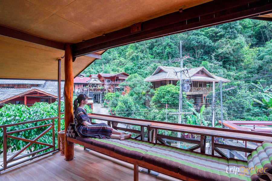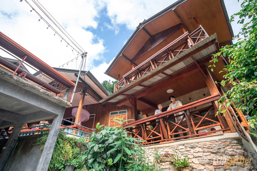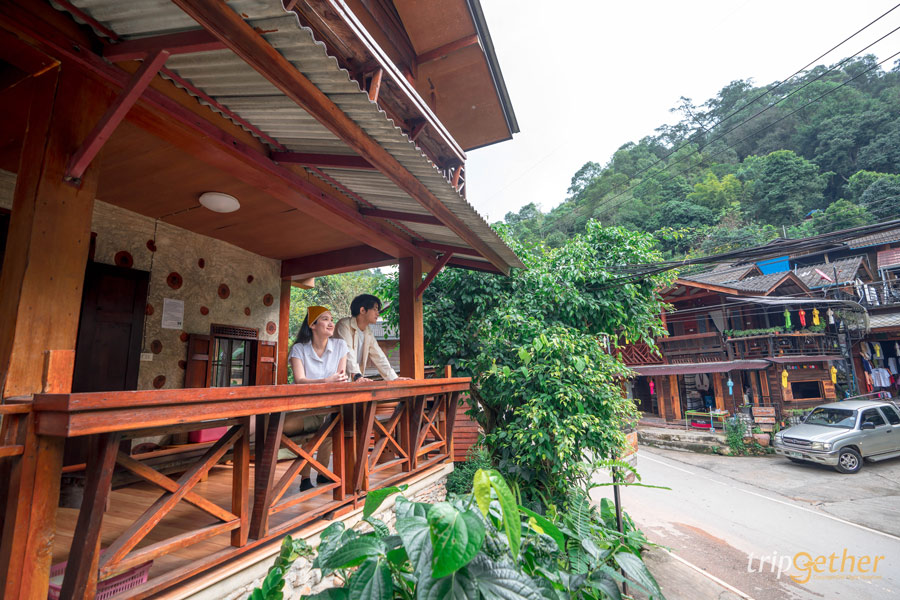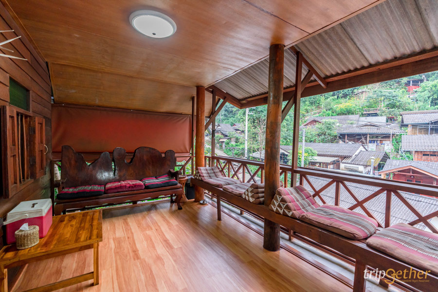 ถัดขึ้นมาอีกหน่อยเป็นที่ตั้งของโฮมสเตย์หลังที่ 3 ซึ่งรองรับผู้เข้าพักได้มากถึง 4 – 12 คน เสน่ห์ของโฮมสเตย์หลังนี้ คือพื้นที่ระเบียงด้านหน้าห้องพักที่มองเห็นวิวทั่วทั้งใจกลางหมู่บ้าน และมีพื้นที่กว้างขวาง สบาย ที่สามารถนั่งเล่น หรือล้อมวงกินข้าว เล่าเรื่อง ได้แบบชิลล์ๆ เลย และถ้าเป็นช่วงเช้าๆ ก็สามารถมานั่งที่บาร์รอดูแสงตะวันค่อยๆ ขึ้นมาทักทายเราจากมุมเขาได้เลย