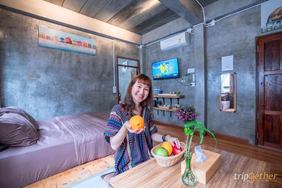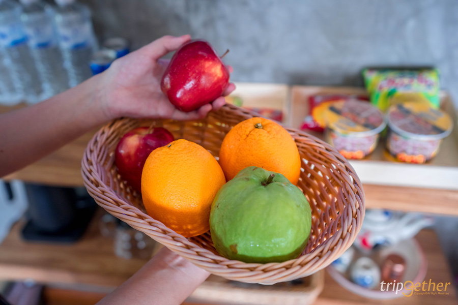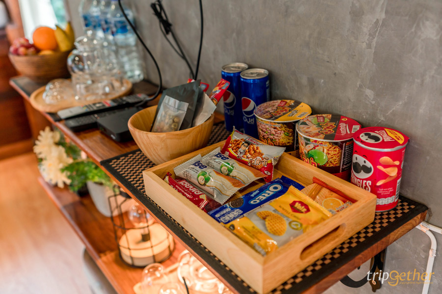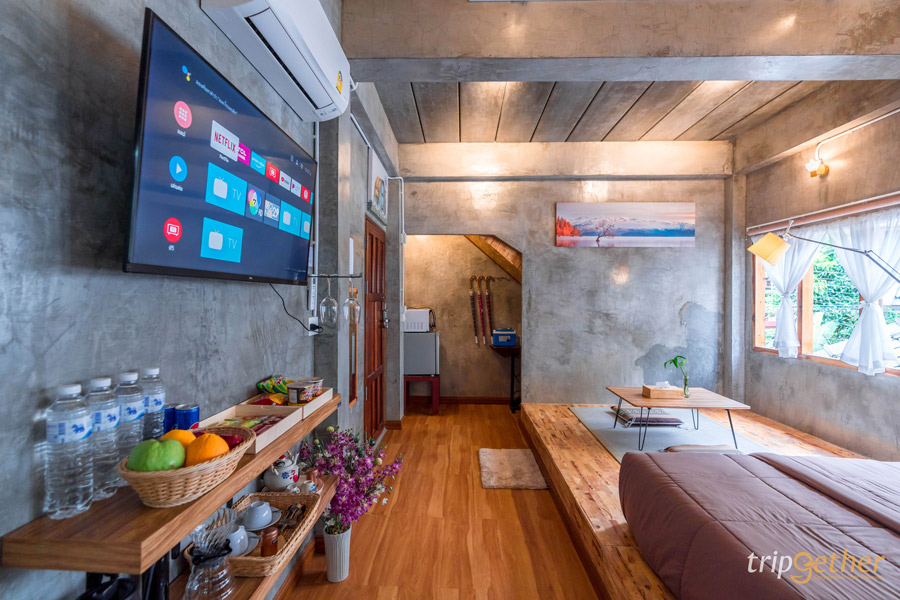 นอกจากนี้ยังมีทีวีที่ล้ำสุดๆ สามารถเชื่อมต่อกับอินเตอร์เน็ตได้ ดูได้ครบทุกอย่างและทุกช่องเพราะ Wi-Fi ของที่นี่เร็วและแรงแบบไม่ลดสปีดจัดเต็มมาให้ผู้เข้าพักโดยเฉพาะ บอกเลยว่ามาพักที่นี่ไม่ต้องกังวลเรื่องการอัปโซเชียลแน่นอน และที่ชั้นเล็กๆ ใต้ทีวียังมีขนมขบเคี้ยว น้ำอัดลม รวมทั้งผลไม้ให้ได้กินกันอย่างเพลินๆ ตอนเล่นโทรศัพท์หรือดูซีรีส์ไปยาวๆ