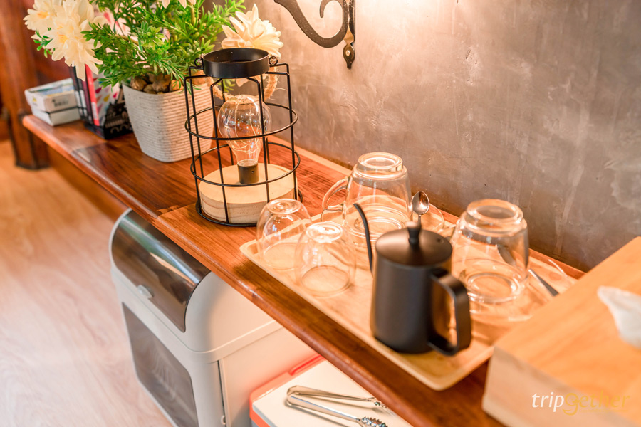 อีกทั้งยังมีโต๊ะบาร์ขนาดกำลังดีริมหน้าต่างด้านที่หันหน้าออกถนนสายหลักกลางชุมชน มุมสบายใจที่เหมาะแก่การนั่งเหม่อมองวิถีของชุมชน ผู้คน และแสงไฟถนนสลัวๆ ที่เงียบสงบยามค่ำคืน หรือในตอนเช้าๆ โต๊ะบาร์และหน้าต่างบานนี้ก็จะฉายภาพของตะวันที่กำลังค่อยๆ ทอแสงที่เหลี่ยมเขา บอกเลยว่าถ้ามีเครื่องดื่มแก้วโปรดสักแก้วมาวางข้างๆ นะ ความสุขคงล้นทั่วแม่กำปองไปเลย