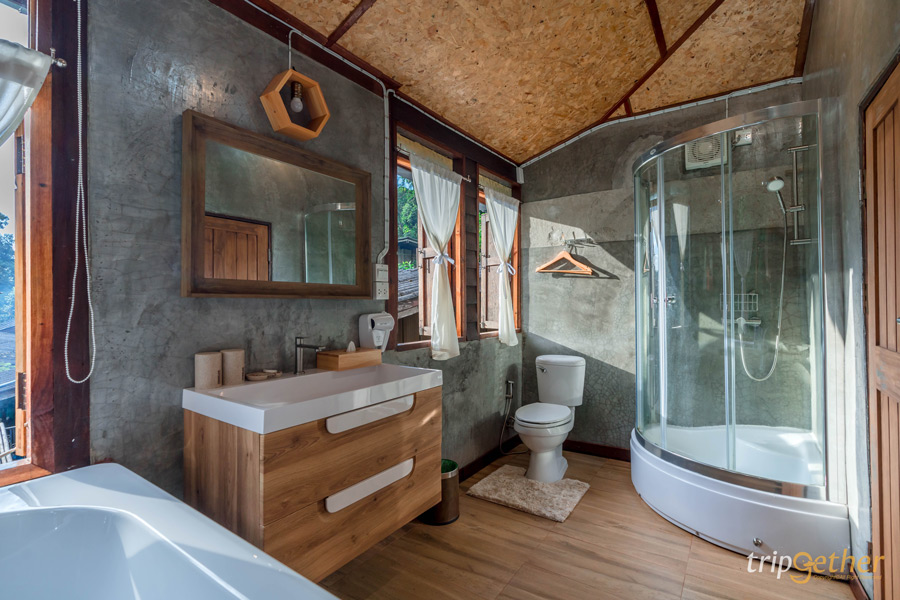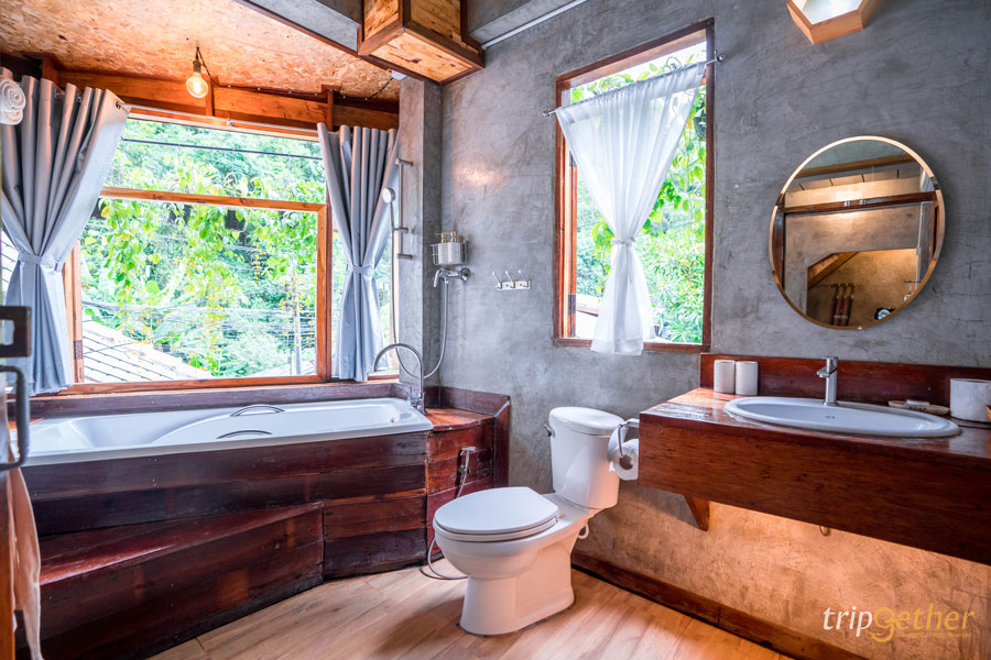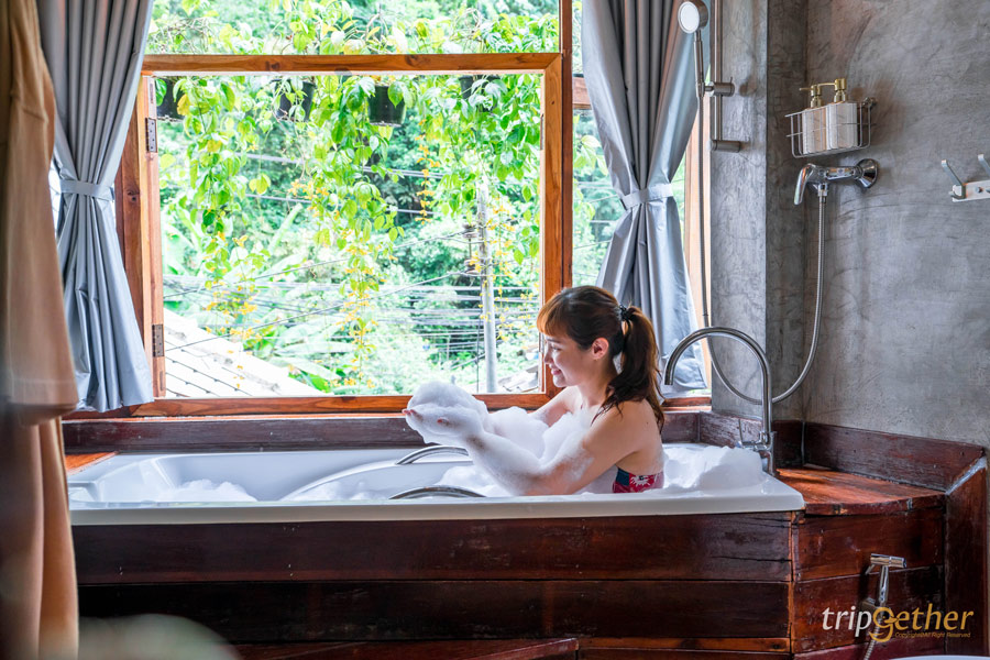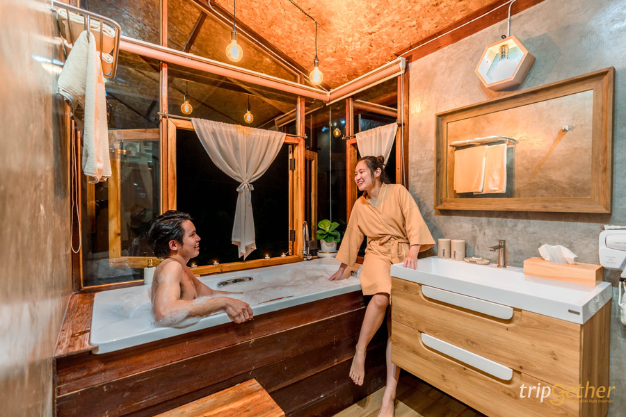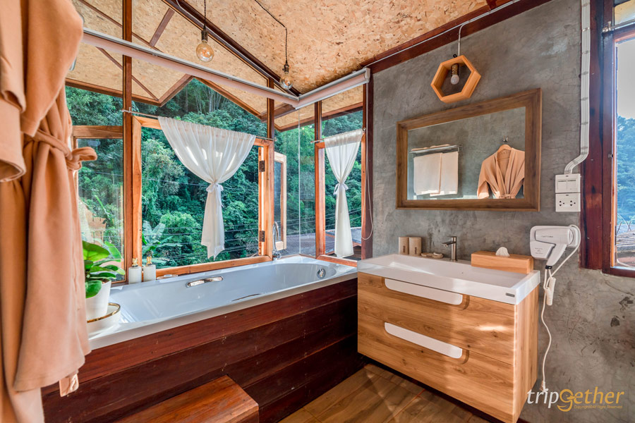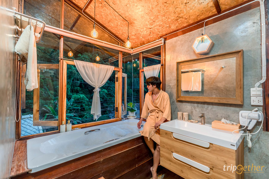 ส่วนความพิเศษของห้องพรีเมียม 2 ก็คืออ่างอาบน้ำที่มาพร้อมกับภาพวิวความเขียวขจีของหมู่แมกไม้ เหมาะกับการแช่น้ำอุ่นๆ ในช่วงเช้าๆ พร้อมกับฟังเสียงธรรมชาติ ไปด้วย ตอบโจทย์การพักผ่อนสบายๆ แบบสไตล์แม่กำปองสุดๆ
