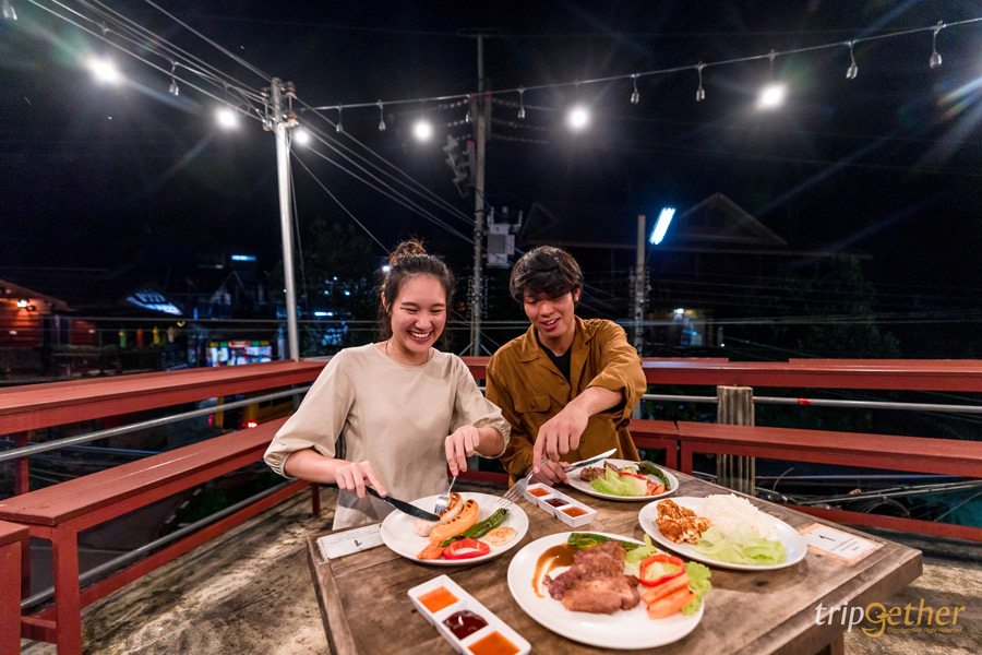 กินมื้อเย็นอร่อยๆ กับบรรยากาศหมู่บ้านตอนกลางคืน บอกเลยว่าพักที่นี่ไม่ต้องเดินไปที่ไหนเลย เพราะเพียงแค่นั่งอยู่ลานดาดฟ้าที่อยู่กลางโฮมสเตย์ก็สามารถเห็นท้องถนนและหมู่บ้านได้อย่างสบายๆ