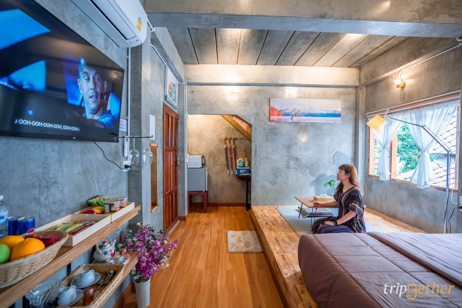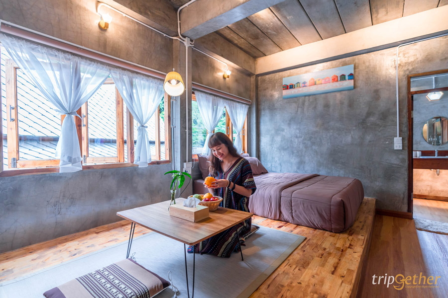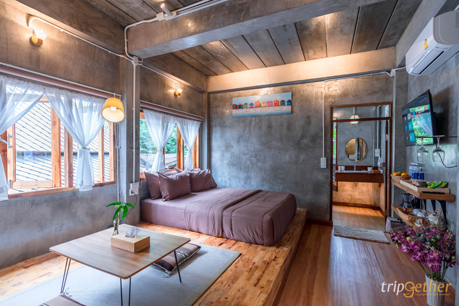 มาต่อกันที่ห้องพรีเมียม 2 ที่ตกแต่งสไตล์โมเดิร์นลอฟต์สุดเรียบหรู เน้นความเป็นธรรมชาติของผนังปูนเปลือย โดยมีกรอบหน้าต่าง บานประตู รวมทั้งเฟอร์นิเจอร์อื่นๆ ที่ทำมาจากไม้ ตกแต่งผสมผสานกันได้อย่างลงตัว นอกจากนี้ภายในห้องก็เรียกได้ว่าบรรยากาศดีเป็นที่สุด เพราะมีหน้าต่างจำนวนมากคอยรับลมเย็นๆ และภาพวิวความกรีนของเหล่าต้นไม้ด้านนอกอีกด้วย