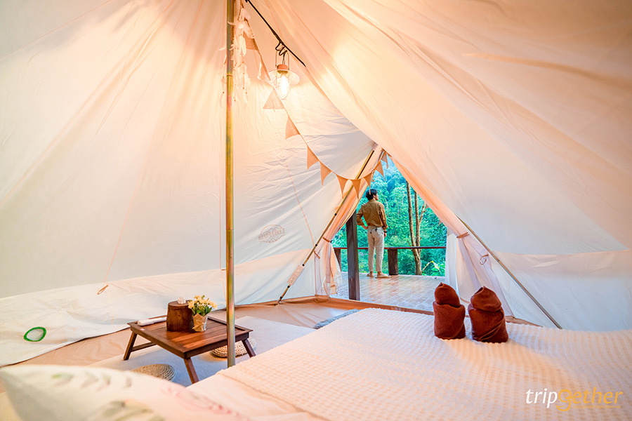 ห้องพักแบบที่สามเป็นห้องพักสุดพิเศษที่ทุกคนสามารถสัมผัสธรรมชาติได้แบบใกล้ชิด นั่นก็คือเต็นท์กระโจมซึ่งจำลองบรรยากาศการพักผ่อนในทุ่งหญ้าที่ไม่ละทิ้งความสะดวกสบาย โดยภายในเต็นท์มีชุดเครื่องนอนที่ครบครัน หมอนนุ่ม ผ้าห่มหนา พร้อมพาทุกคนเข้าสู่ภวังค์แห่งความฝัน อีกทั้งยังมีพื้นที่พร้อมโต๊ะขนาดเล็กให้ได้นั่งเล่นหรือใช้เวลากับหนังสือเล่มโปรด นอกจากนี้ยังมีเครื่องปรับอากาศที่สามารถมอบให้ได้ทั้งความเย็นสบายและความอบอุ่น