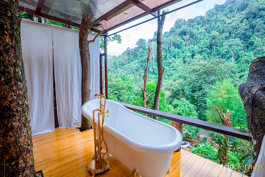 ความพิเศษของห้องพักแบบเต็นท์กระโจมคืออ่างอาบน้ำแบบ outdoor ที่จะนำทุกคนเข้าสู่ความผ่อนคลายท่ามกลางความสงบ นอนแช่ตัวในน้ำอุ่นๆ ให้อากาศเย็นบริสุทธิ์มาสัมผัสร่างกายเบาๆ หรือจะนั่งทิ้งกายทิ้งใจบนเปลผ้าที่สานมาอย่างดีพร้อมกับชมบรรยากาศการแสดงจากธรรมชาติและม่านหมอกในขณะที่พักผ่อน บอกเลยว่าความรู้สึกนี้สุดแสนจะบรรยายจริงๆ