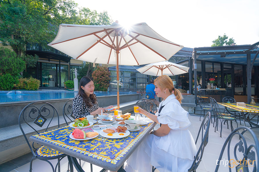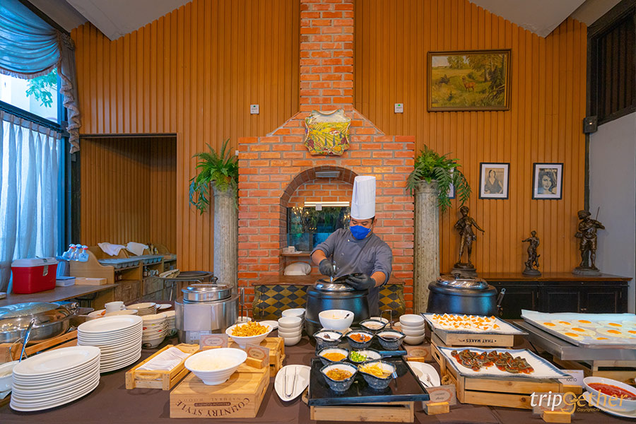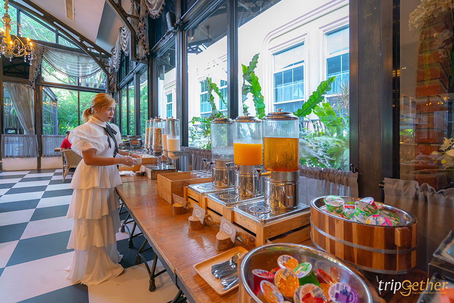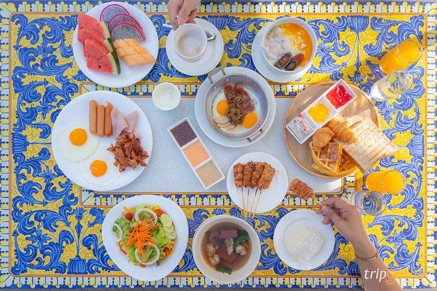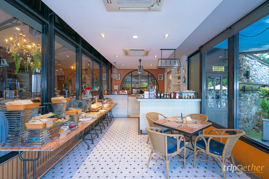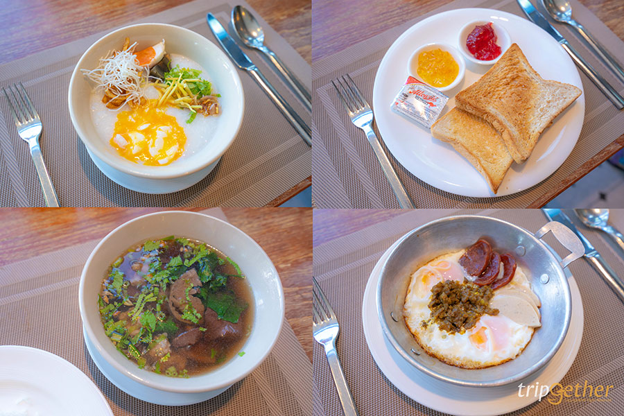 มาถึงอาหารเช้ากันแล้วห้องอาหารเช้าของรีสอร์ตเปิดให้บริการตั้งแต่ 06.00 – 10.00 น. เมนูอาหารของที่นี่มีให้เลือกทั้งอเมริกันเบรคฟาสต์ อาหารไทยอย่างข้าวต้ม โจ๊กหมู ต้มเลือดหมู เป็นแบบบุฟเฟต์กินกันได้เรื่อยๆ เลย หากมีผู้เข้าพักไม่เกิน 20 คน ทางรีสอร์ตจะเสิร์ฟอาหารแบบอะลาคาร์ทแทน แต่สามารถสั่งได้เรื่อยๆ จนถึง 10.00 น. เมนูอาหารแบบบุฟเฟต์จะมีในส่วนของโซนขนมปัง แฮม เบคอน ไส้กรอก แยมรสชาติต่างๆ