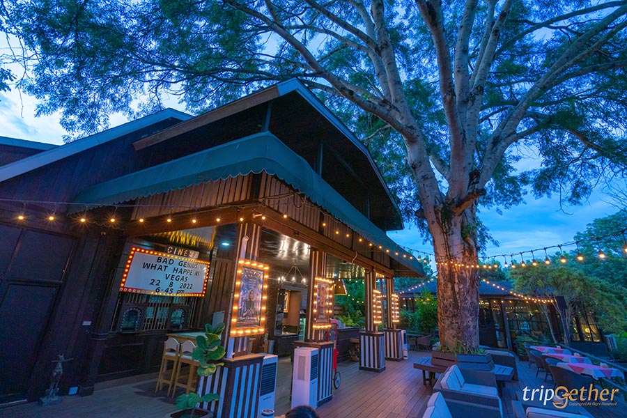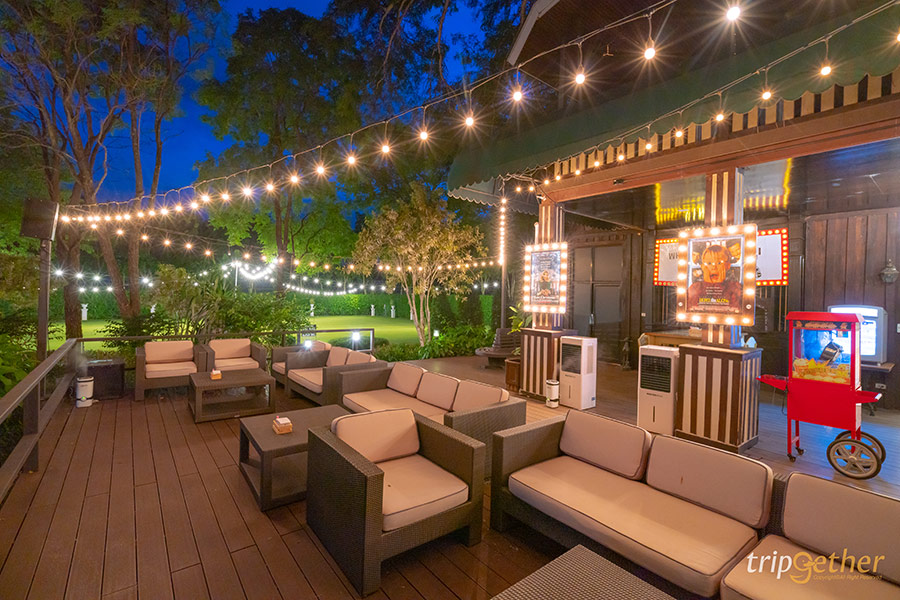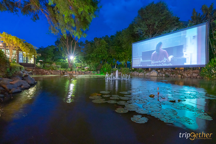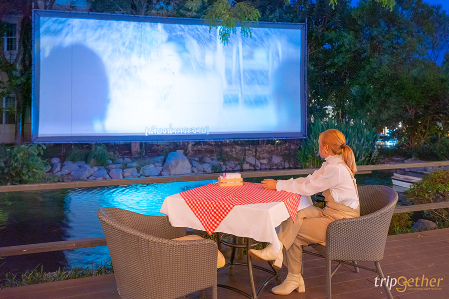 ส่วนในช่วงเย็นที่รีสอร์ตก็มีกิจกรรมสุดพิเศษคือฉายหนังกลางแปลง ซึ่งมีหนังฉายทุกวันวันละ 1 เรื่อง โปรแกรมหนังจะเปลี่ยนไปทุกวันและจะเริ่มฉายตั้งแต่เวลา 18.45 – 22.00 น. ที่บริเวณลานพิมาน ลานนี้จะอยู่ติดกับล็อบบี้เลย อยากบอกว่าบรรยากาศโรแมนติกสุดๆ ดูหนังท่ามกลางแสงไฟสวยๆ ถ้าใครอยากสั่งอาหารหรือเครื่องดื่มก็สามารถสั่งได้จากร้านอาหาร Chez Sonia ของรีสอร์ตได้เลย
