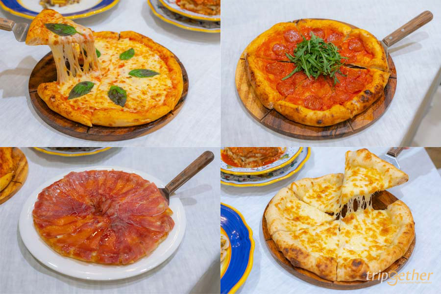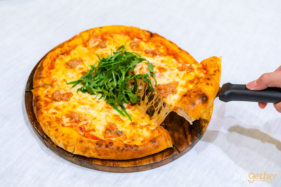 มาเริ่มกันที่เมนูแสนอร่อยอย่างพิซซ่าที่มีให้เลือกหลากหลายหน้า วันนี้เราจะมาแนะนำทั้งหมด 5 เมนู คือ Margaherita, Pepperoni, Four Cheese, RCV Special (Parma Ham) และ Italian Sausage ความพิเศษคือพิซซ่าของที่นี่เป็นพิซซ่าเตาถ่าน
