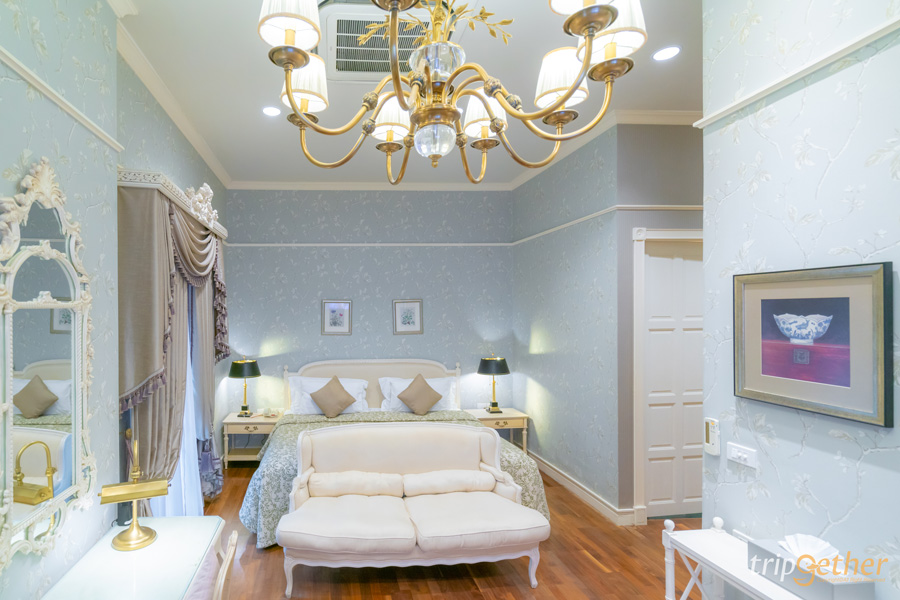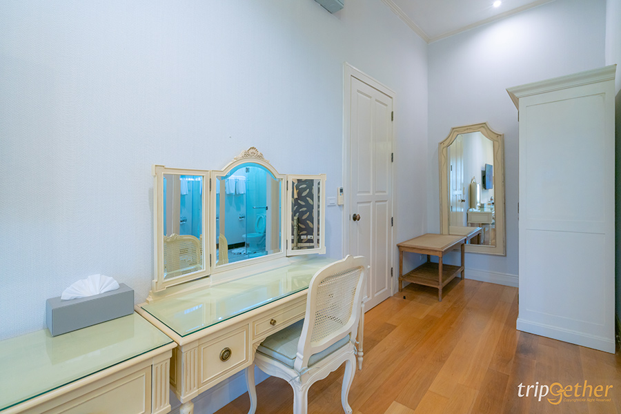 ห้องนอนแรกเป็นเตียงแบบ King size นุ่มสบาย พร้อมกับโต๊ะเครื่องแป้ง และห้องน้ำในตัวเลย