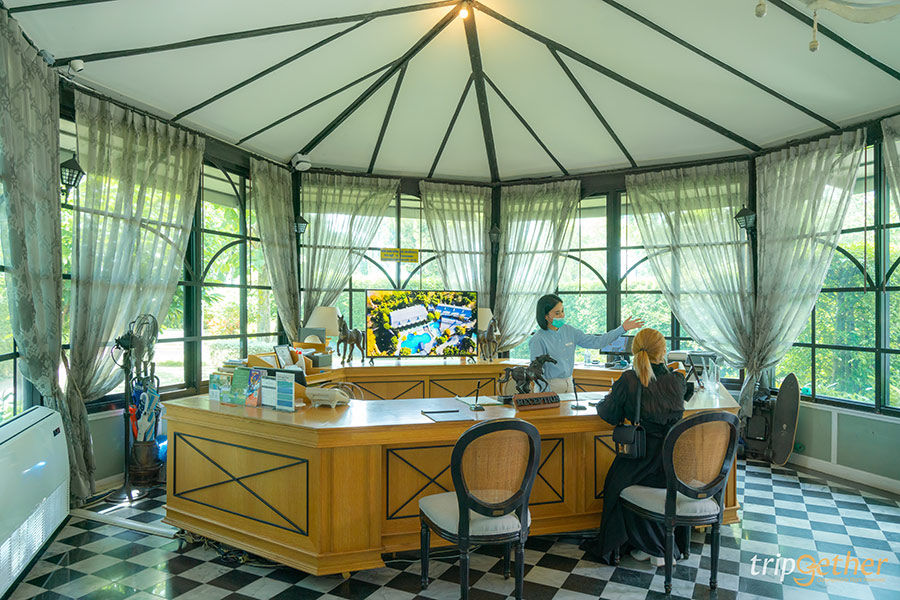 การตกแต่งของที่นี่เป็นสไตล์ยูโรเปียนคันทรี เริ่มจากที่ล็อบบี้กันเลย เมื่อเดินไปด้านในตัวอาคารจะมีความโปร่งโล่งและเป็นกระจกรอบด้านทำให้สามารถมองเห็นวิวของรีสอร์ตได้โดยรอบ มีการจัดวางเฟอร์นิเจอร์ต่างๆ อย่างลงตัว