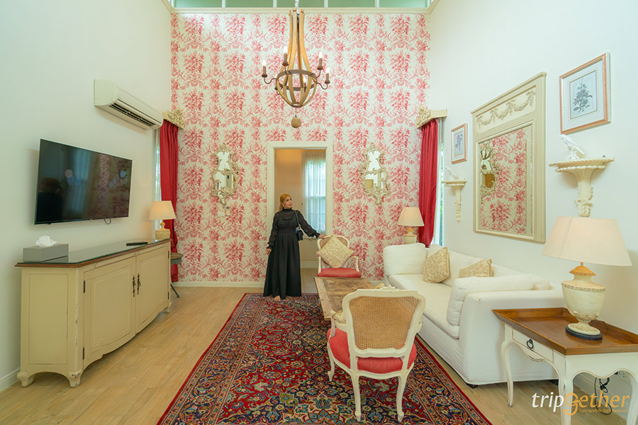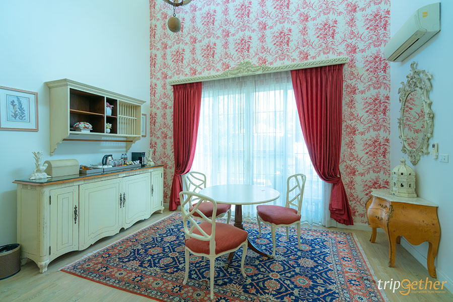 ภายในห้องแบ่งโซนเป็นมุมสำหรับนั่งพักผ่อนดูโทรทัศน์ และมุมนั่งเล่นที่อยู่ใกล้ๆ กับมินิบาร์ กินขนม จิบชาเพลินๆ