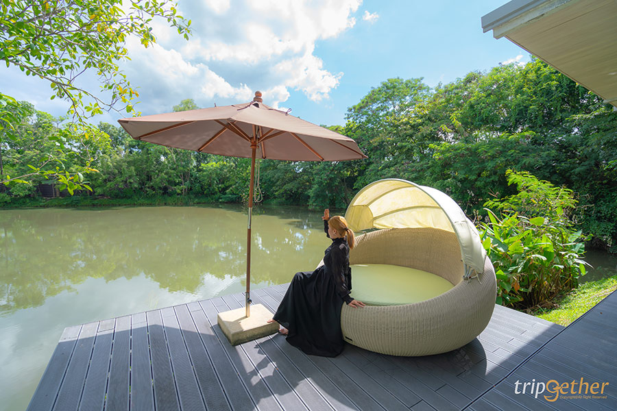 เปิดประตูออกมานั่งเล่นริมทะเลสาบส่วนตัวกันสักหน่อย บอกเลยว่าบรรยากาศดีมากๆ บริเวณริมระเบียงมีโซฟาเบดทรงกลมให้นั่งชิลล์กันด้วย