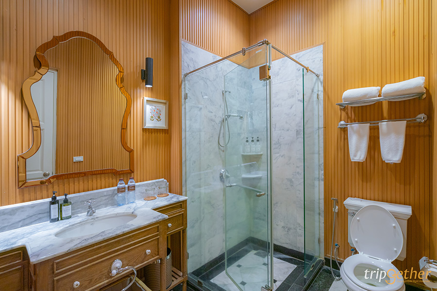 ส่วนห้องน้ำแยกโซนแห้งและโซนเปียกอย่างชัดเจนพร้อมกับสิ่งอำนวยความสะดวกอย่าง ผ้าเช็ดตัว แชมพู ครีมอาบน้ำ
