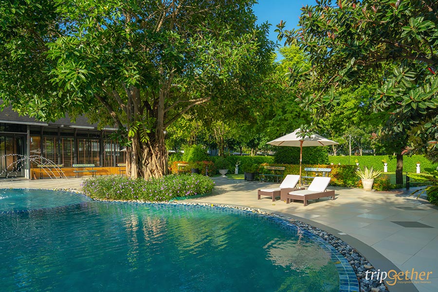 สระว่ายน้ำส่วนกลางของที่นี่บอกเลยว่าใหญ่มาก เตรียมชุดว่ายน้ำมาให้พร้อมถ่ายรูปสวยๆ ได้เลย