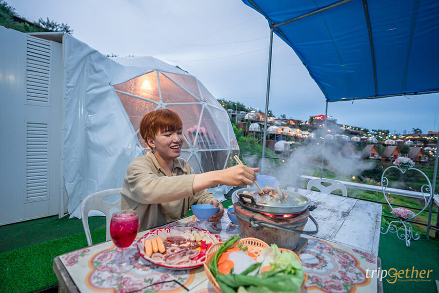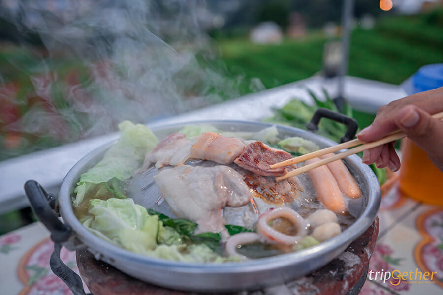 และที่พลาดไม่ได้เลยคือการสั่งหมูกระทะมากินหน้าห้อง ปิ้งหมูกระทะฉ่ำๆ ท่ามกลางอากาศเย็นๆ คือฟินสุดๆ หรือใครจะสั่งเป็นอาหารตามสั่งก็ได้เช่นกัน ครัวที่นี่ปิดเวลา 20.00 น. ส่วนหมูกระทะสั่งกันได้เรื่อยๆ เลย