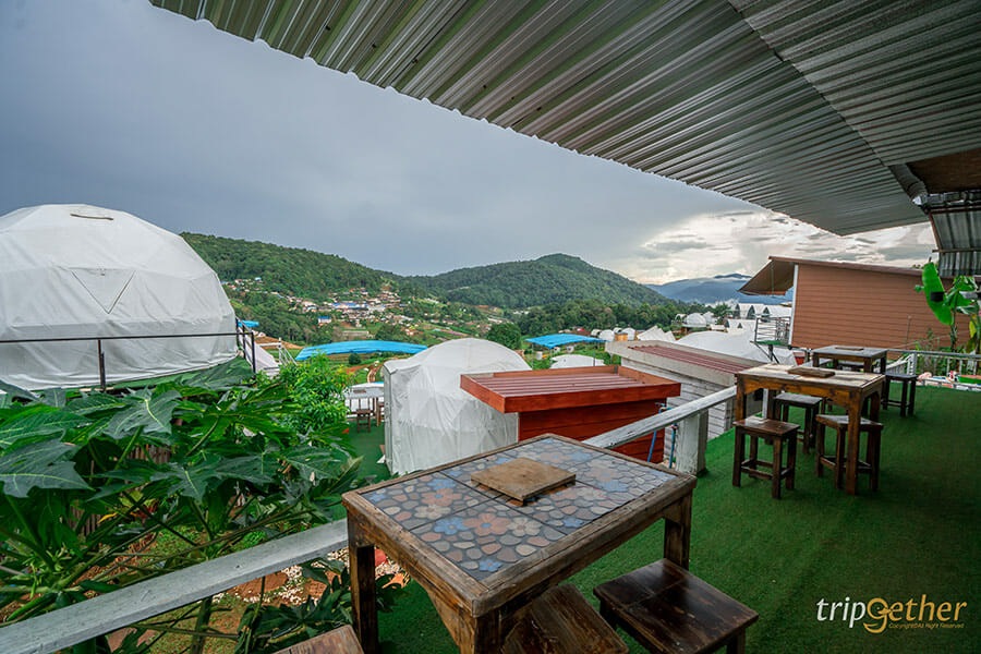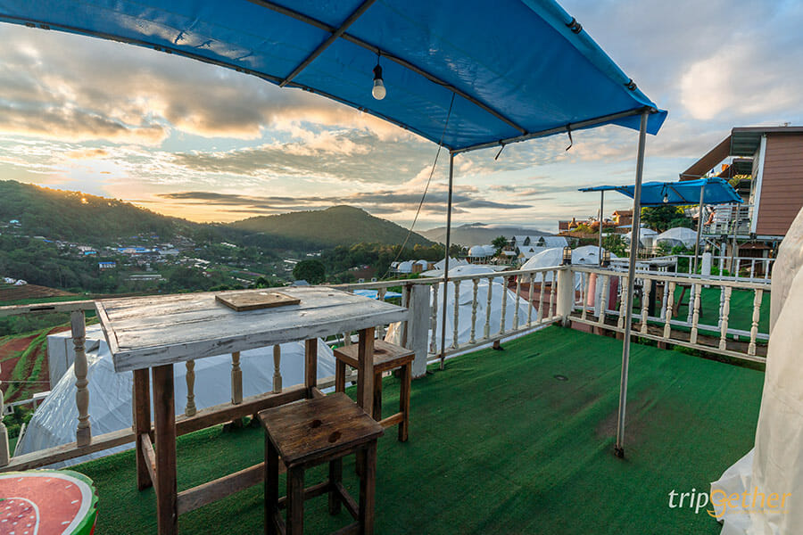 บริเวณหน้าเต็นท์มีระเบียงกว้างให้นั่งเล่นชิลล์ๆ ตกเย็นก็สั่งหมูกระทะสักหนึ่งชุดมากินกันแบบฟินๆ