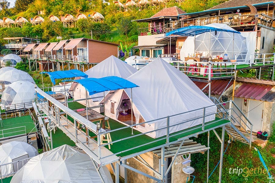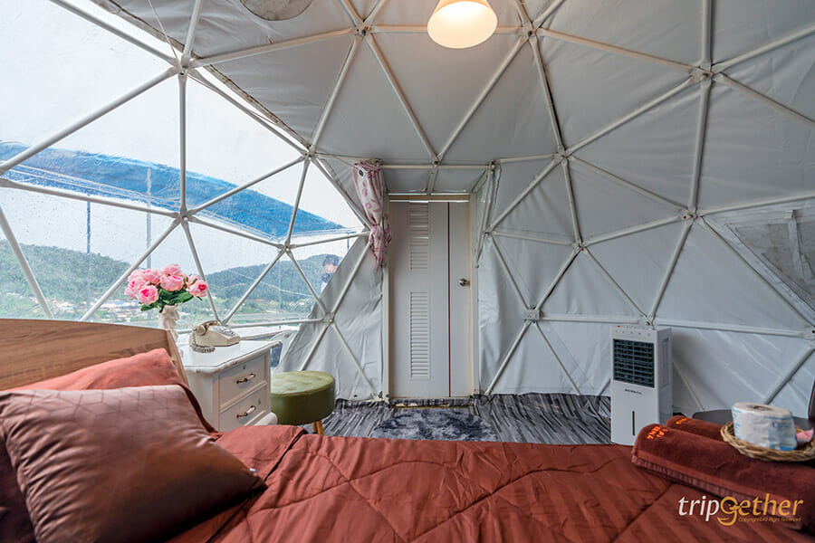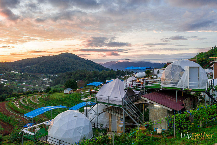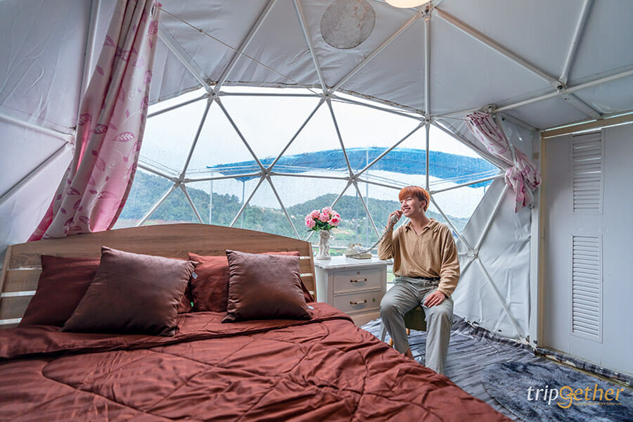 มาเริ่มกันที่ เต็นท์โดม เต็นท์ทรงโดมขนาดใหญ่ที่ภายในกว้างขวาง มีหน้าต่างใสที่สามารถมองเห็นวิวภูเขาได้จากภายในเต็นท์ ตกแต่งด้วยเฟอร์นิเจอร์สไตล์วินเทจหวานๆ ใครที่เป็นสายถ่ายรูปต้องถูกใจเพราะจะได้รูปสวยๆ มุมชิคๆ จากในเต็นท์เอาไว้ลงโซเชียลแน่นอน นอกจากมุมถ่ายรูปสวยๆ แล้วสิ่งอำนวยความสะดวกอย่างผ้าเช็ดตัว สบู่ แชมพู ทิชชู่ พัดลม ทางที่พักก็มีเตรียมไว้ให้เช่นกัน