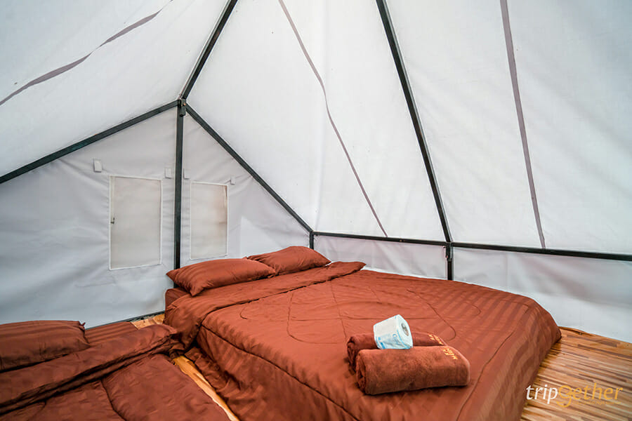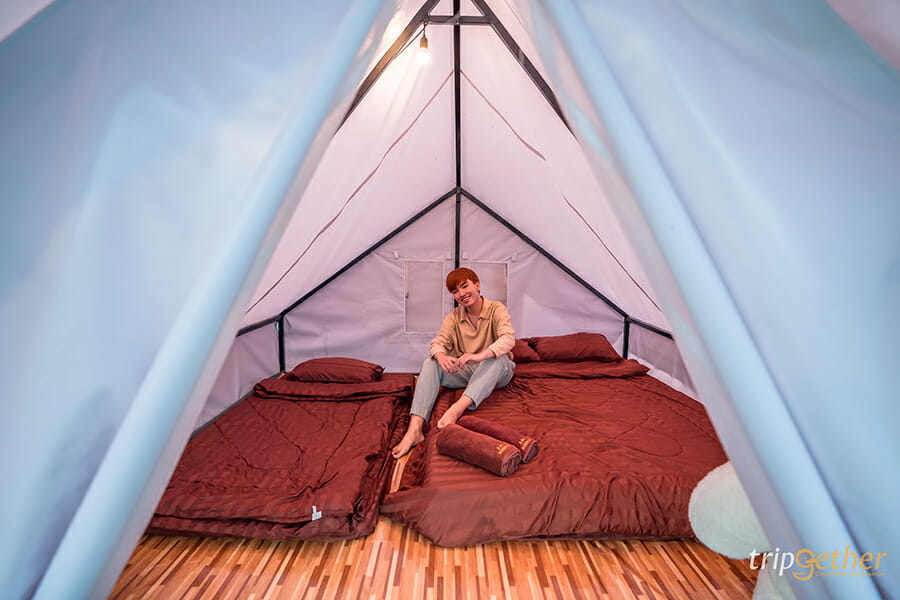ต่อมาคือ เต็นท์โดมสามเหลี่ยมแฝด เป็นเต็นท์โดมสามเหลี่ยมสองหลังตั้งไว้คู่กัน ด้านในเต็นท์ก็ถูกตกแต่งไว้อย่างน่ารักเช่นกัน เต็นท์นี้จะนอน 2 คน หรือเสริม 3 คน ก็นอนได้แบบสบายๆ ไม่อึดอัดเลย ด้านหน้าเต็นท์มีระเบียงส่วนตัวสามารถมองเห็นของแปลงผักและภูเขาได้เช่นกัน