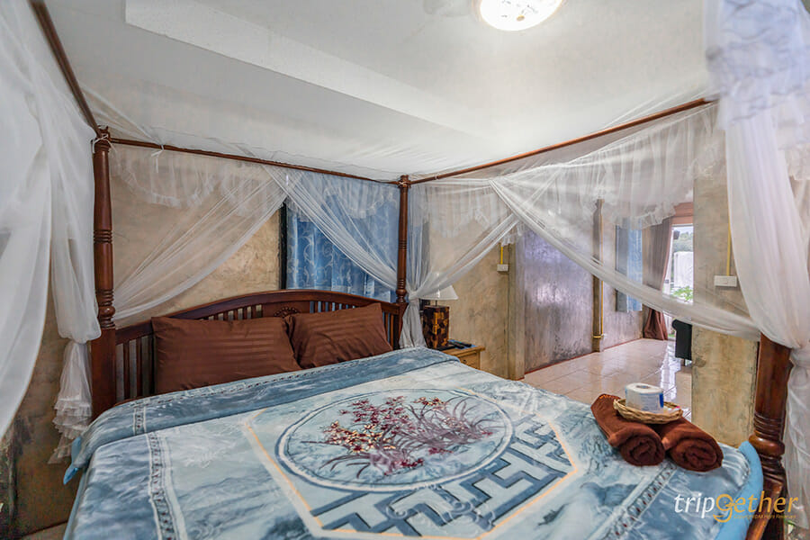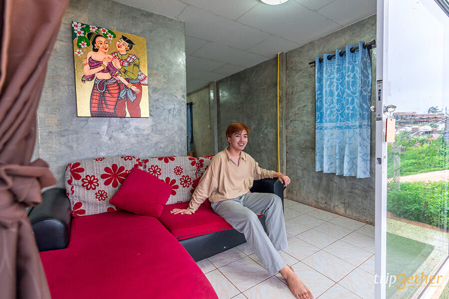 มาต่อกันที่ห้องพักในตัวอาคารกัน การตกแต่งภายในของห้องนี้ก็มีความเป็นสไตล์วินเทจผสมผสานกับความลอฟท์ด้วยผนังแบบปูนเปลือย มีห้องน้ำในตัว เมื่อเปิดประตูเข้าไปก็จะพบกับมุมนั่งเล่นที่หันหน้าออกให้ได้มองเห็นวิวจากในห้องพัก ถัดเข้าไปด้านในจะเป็นเตียงไม้สี่เสาสุดคลาสสิก ภายในห้องกว้างขวางมีสิ่งอำนวยความสะดวกมากมายไม่ว่าจะเป็น ทีวี พัดลม เครื่องทำน้ำอุ่น ผ้าเช็ดตัว ทิชชู่ สบู่ แชมพู ทางด้านหน้าห้องพักก็มีระเบียงสำหรับนั่งเล่น สั่งอาหารหรือหมูกระทะมากินแบบชิลล์ๆ ได้ด้วย