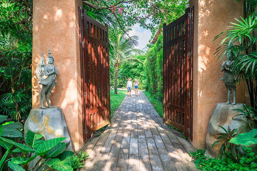 เมื่อเข้ามาภายในพื้นที่ของรีสอร์ท แค่บริเวณด้านหน้าล็อบบี้ ก็สะดุดตาตั้งแต่แรกเห็นด้วยอาคารเปิดโล่งที่นำไม้ไผ่มาเป็นโครงสร้างหลัก ที่ให้ความรู้สึกอบอุ่นและเข้าถึงง่ายสำหรับรีสอร์ทระดับ 5 ดาว