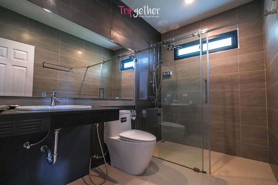 ห้องน้ำเรียบหรู มีม่านกระจกแยกโซนเปียกและโซนแห้งอย่างชัดเจน ให้คุณใช้พื้นที่ส่วนตัวในห้องน้ำได้อย่างสะดวกสบาย พร้อมอุปกรณ์เครื่องใช้ในห้องน้ำ อย่าง สบู่ แชมพู หมวกคลุมผม คอตตอนบัต และชุดแปรงสีฟัน