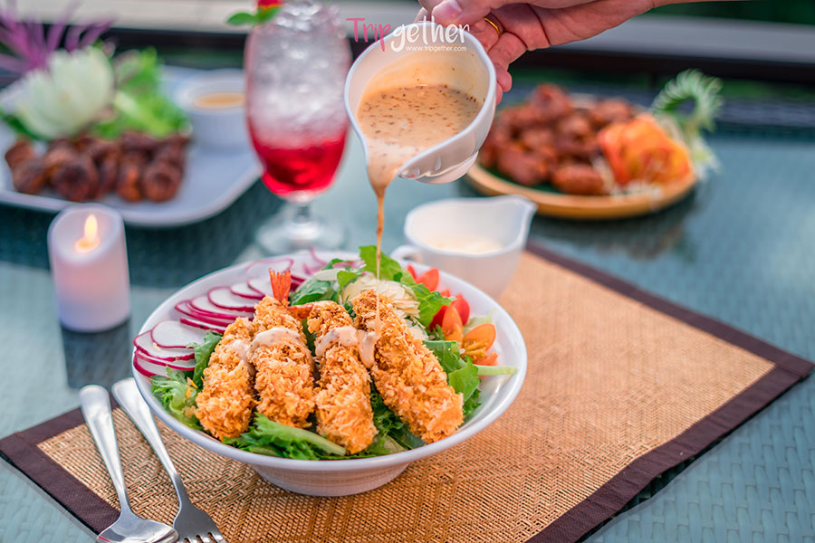 ปิดท้ายด้วย สลัดกุ้งทอด ผักสลัดสดกรอบรสชาติดี กุ้งตัวใหญ่เต็มคำ เสิร์ฟคู่กับน้ำสลัดครีมและน้ำสลัดครีมพริกไทยดำ ราคา 180 บาท