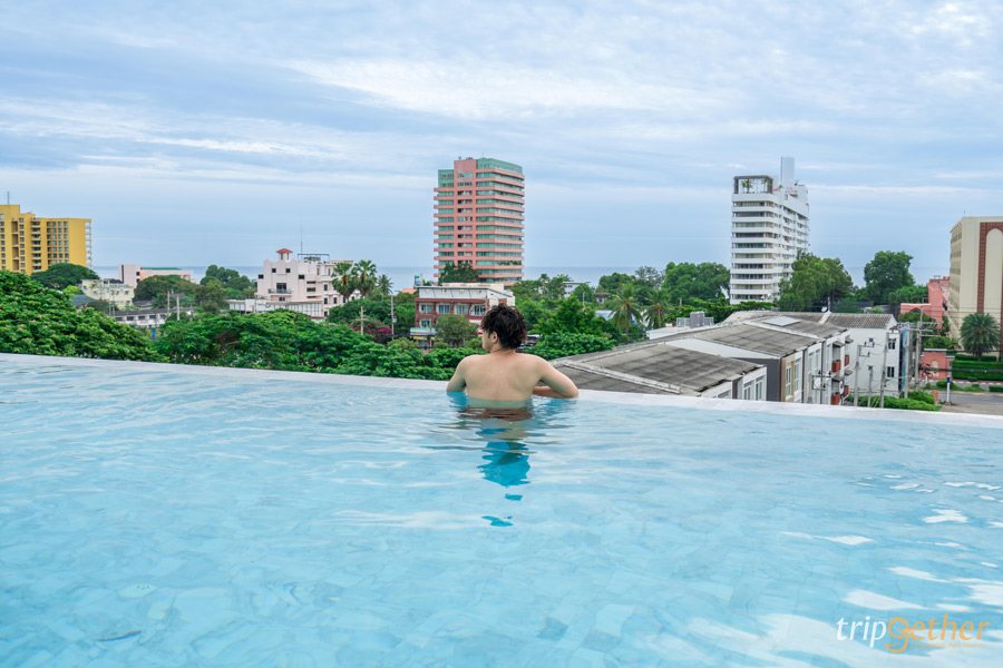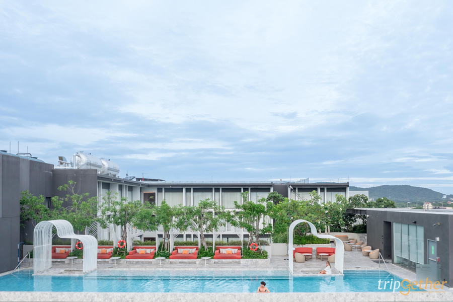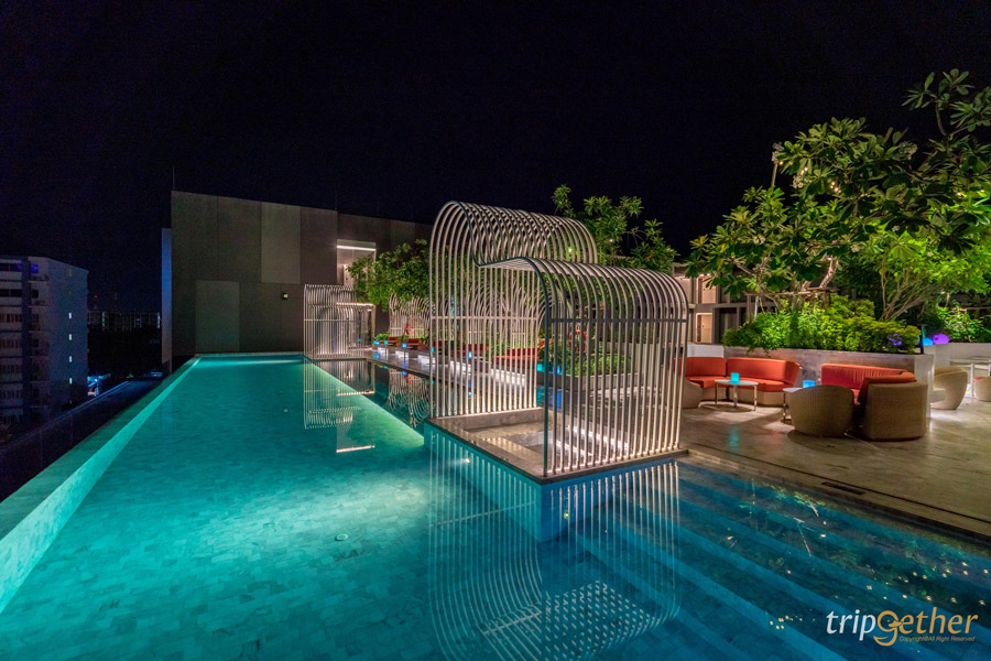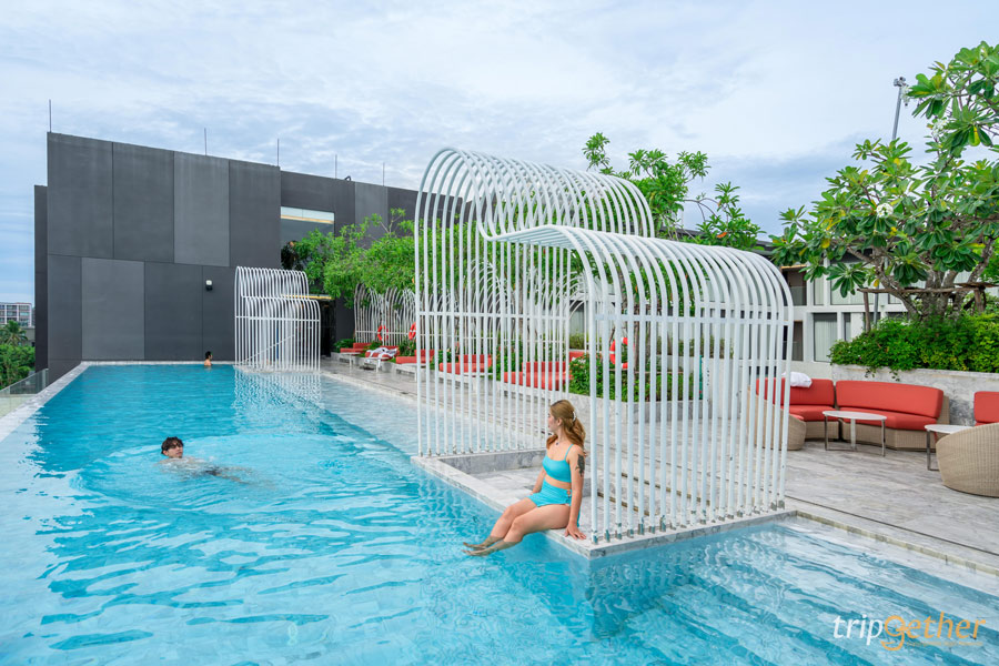 ตื่นเช้ามาแช่น้ำที่สระว่ายน้ำหินอ่อนแบบ Infinity pool ชั้นดาดฟ้า อีกหนึ่งไฮไท์ของ dusitD2 Hua Hin สระว่ายน้ำเปิดตั้งแต่เวลา 07.00 – 19.00 น. ด้านข้างยังมีฟิตเนสเซ็นเตอร์เปิดให้บริการอยู่ด้วย