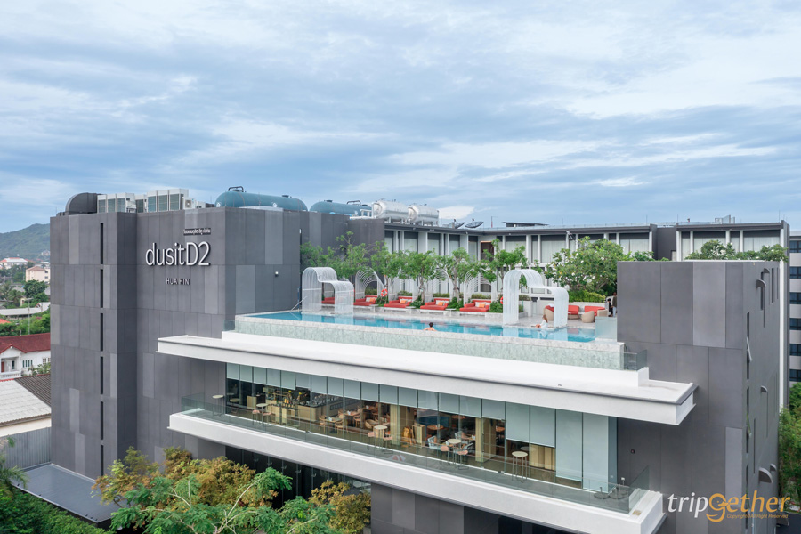 dusitD2 Hua Hin (ดุสิตดีทู หัวหิน) โรงแรมระดับ 4 ดาว ใจกลางเมืองหัวหินตั้งอยู่ในโลเคชั่นที่เดินทางสะดวก ไม่ไกลจากชายหาดหัวหิน เพียงแค่เลี้ยวรถจากถนนใหญ่จะได้พบกับอาคารสีเทาแบบ Low-Rise 7 ชั้น สไตล์โมเดิร์นตั้งเด่นสะดุดตา และสัมผัสได้ถึงบรรยากาศแสนร่มรื่นจากต้นไม้มากมายตั้งแต่ทางเข้า บอกเลยว่าเหมาะกับการมาพักผ่อนกับครอบครัวหรือคนรักเป็นที่สุด ที่สำคัญใครเป็นทาสแมว ทาสหมา dusitD2 Hua Hin ยินดีต้อนรับผู้เข้าพักที่พาน้องๆ มาเที่ยวหัวหินกันด้วยนะ เพราะที่นี่เป็นโรงแรมแบบ Pet Friendly นั่นเอง แถมยังมีไฮไลท์อยู่ที่สระว่ายน้ำหินอ่อนแบบ Infinity pool ให้ได้ว่ายน้ำอย่างเพลิดเพลินอีกด้วย