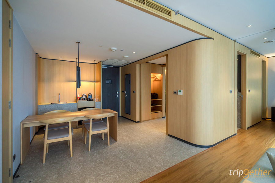 ปิดท้ายกันที่ห้อง Dusit Suite ความพิเศษคือรูมไทป์นี้มีเพียง 4 ห้องพักเท่านั้น ห้องนี้หมาะกับคู่รักที่ต้องการมาใช้เวลาร่วมกันหรือทริปฮันนีมูนเป็นที่สุด เพราะพื้นที่ห้องมีขนาดกว้างขวางถึง 62 ตร.ม. พร้อมหน้าต่างสูงจากเพดานจรดพื้นทำให้สามารถมองวิวทิวเขาได้แบบเต็มๆ แถมยังแบ่งสัดส่วนได้อย่างดี ทั้งห้องนอนที่กันโซนไว้เแบบส่วนตัว