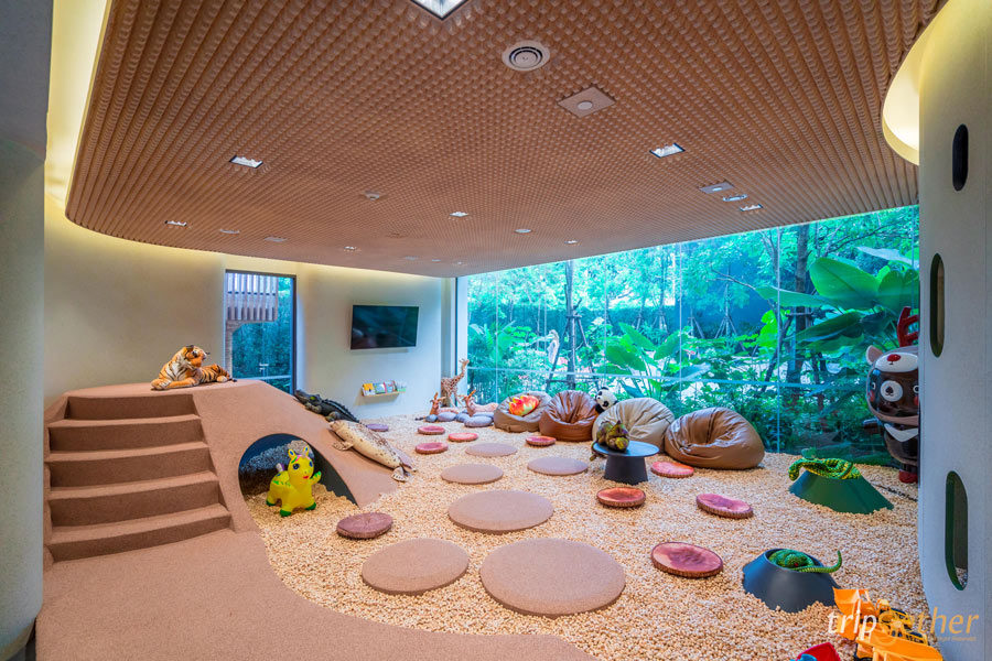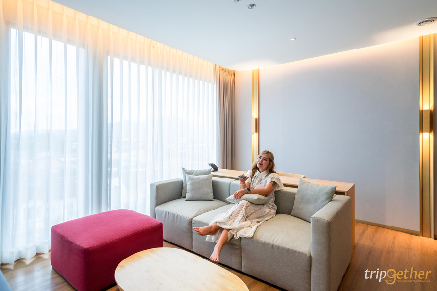 ภายในห้องตกแต่งทันสมัย มีพื้นที่กว้างขวางให้นั่งพักผ่อนได้แบบสบายๆ ห้องนี้เหมาะกับการพาเด็กๆ มาเปลี่ยนที่นอนเป็นที่สุด