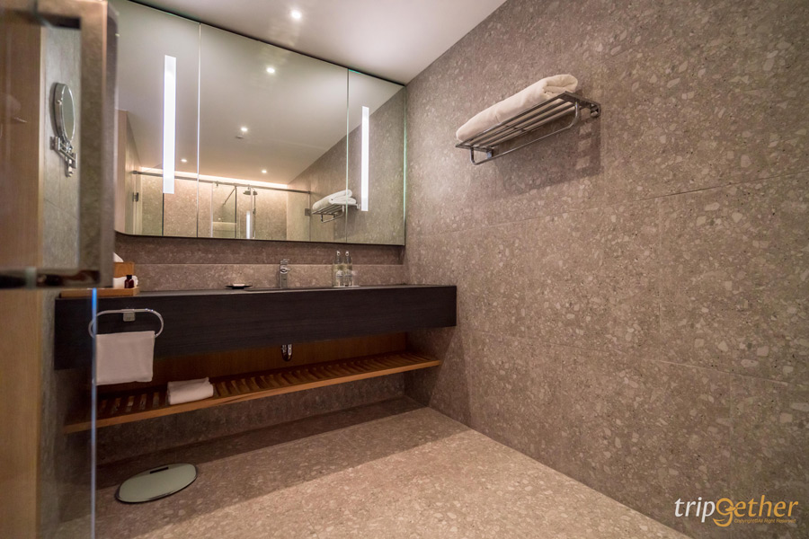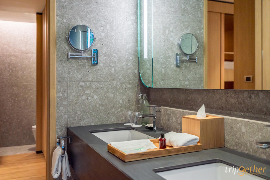 สำหรับห้องน้ำของห้อง Dusit Suite มีขนาดกว้างขวางเป็นพิเศษ เพราะมีทั้งฝักบัวอาบน้ำ อ่างจากุชชี และอ่างล้างหน้าสองอ่าง ไม่เท่านั้นโซนห้องน้ำยังมีพื้นที่แต่งตัวแบบ Walk-in Closet เล็กๆ อีกด้วย