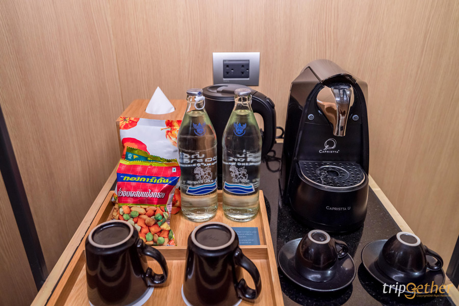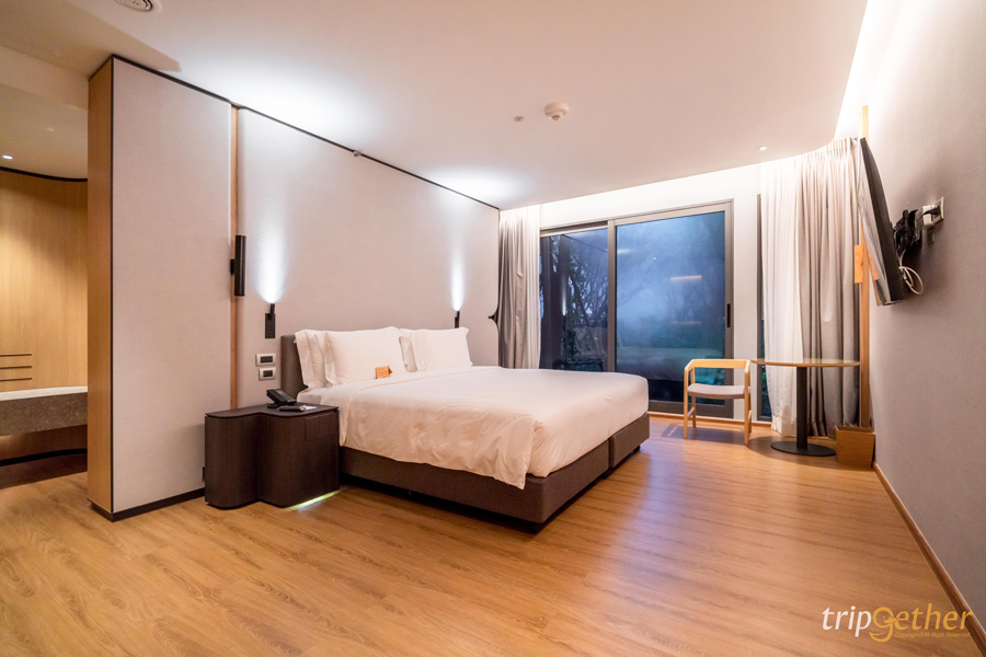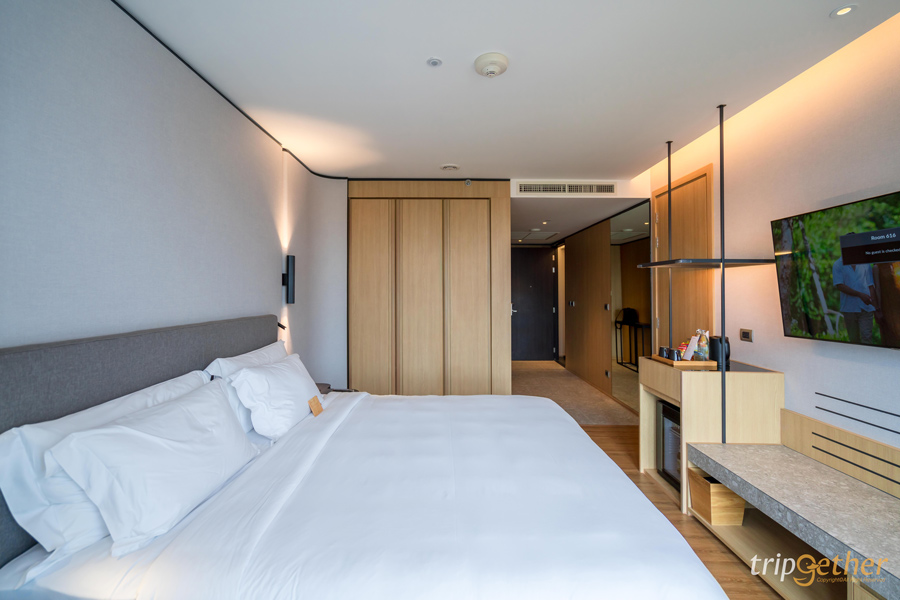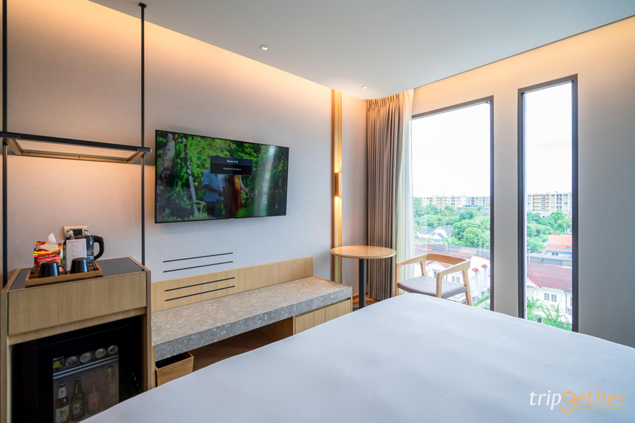 เริ่มกันที่ห้อง Family Studio ในพื้นที่กำลังพอดี 37 ตร.ม. มีหน้าต่างบานใหญ่ให้มองวิวภูเขาได้แบบเต็มๆ ตา ภายในห้องมีสิ่งอำนวยความสะดวกครบไม่ว่าจะสมาร์ททีวี UHD 4K ตู้เย็นเล็ก ตู้เซฟ เสื้อคลุมอาบน้ำ รองเท้าแตะภายในบ้าน เซ็ทอุปกรณ์ชงชาและกาแฟ โต๊ะนั่งริมหน้าต่าง Wi-Fi ฟรี จุดเชื่อมต่อสาย USB