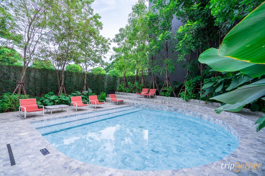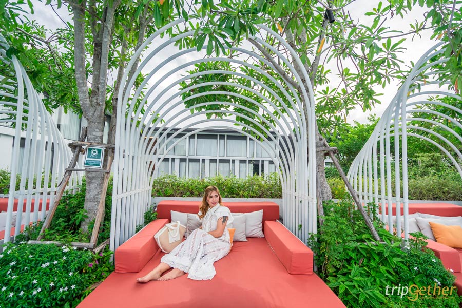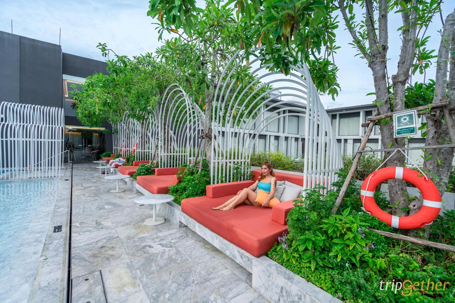 มุมที่นั่งริมสระเป็นอีกหนึ่งไฮไลท์ที่บอกเลยว่าถ่ายรูปปัง กดชัตเตอร์ได้รัวๆ เพราะที่นั่งโซฟาส้มริมสระตัดกับสีขาวของหินอ่อน สีเขียวของต้นไม้ได้อย่างสวยงาม