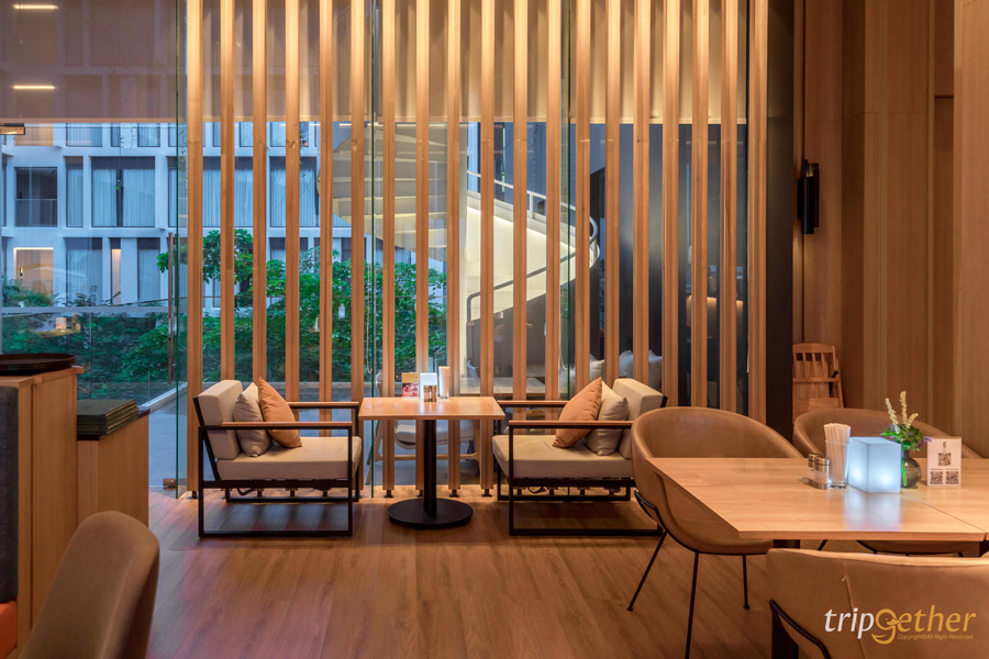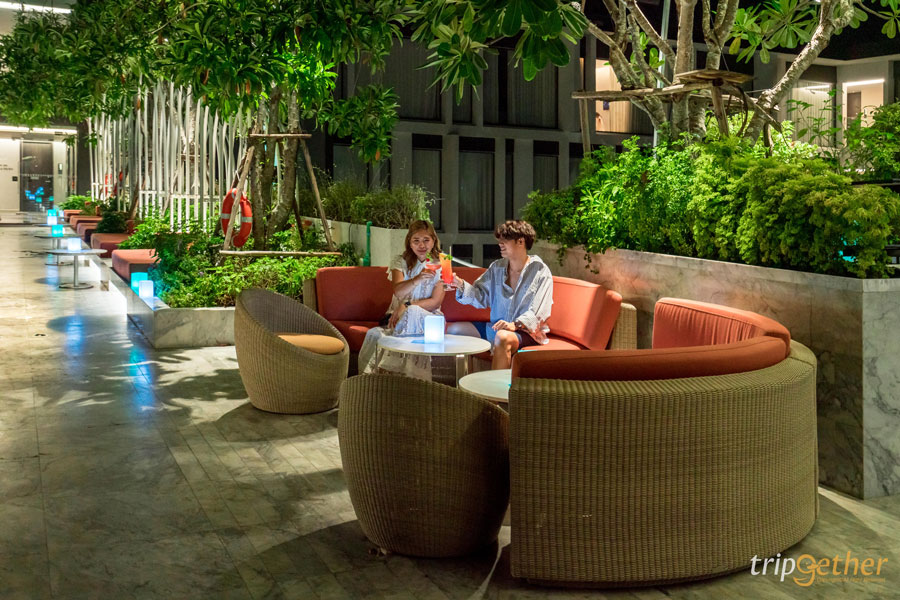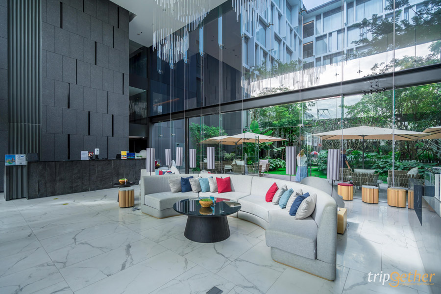 เดินเข้ามาภายในโรงแรมจะพบกับส่วนของโถงล็อบบี้ที่ออกแบบไว้อย่างดี ให้ความรู้สึกโล่งและโปร่งจากเพดานที่สูงและผนังกระจกซึ่งกันโซนระหว่างทางเข้า ล็อบบี้ และโซนสวนป่าไม้ไว้ได้อย่างเป็นสัดส่วน ตรงกลางมีโซฟาเพื่อให้ผู้เข้าพักได้นั่งรอเช็คอินกันอย่างสบายๆ