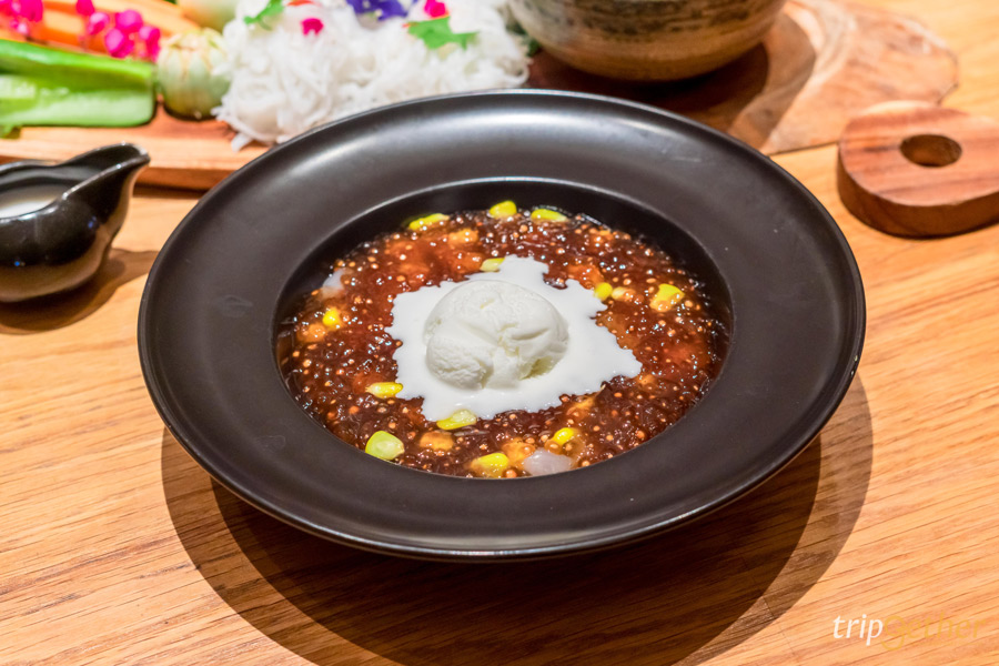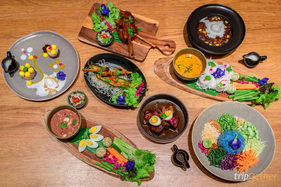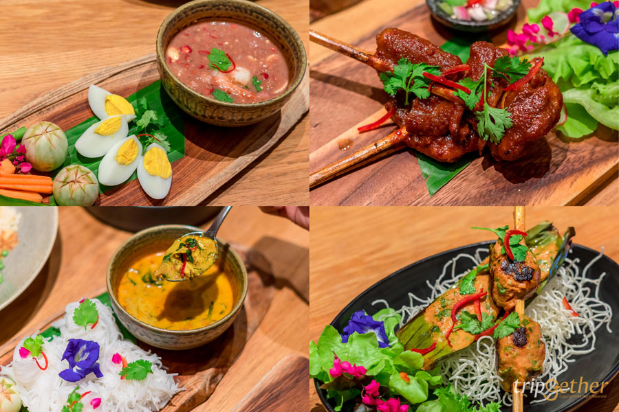 อีกสองเมนูอาหารใต้ที่มาแล้วต้องสั่งคือ แกงปูใบชะพลูกับเส้นขนมจีน (ราคา 340 บาท) รสชาติหวานนิดๆ ตัดด้วยเค็ม เผ็ดปลาย สามารถเลือกสั่งได้ว่าจะกินคู่กับเส้นขนมจีนหรือเส้นหมี่ก็ได้ตามความชอบ เสิร์ฟคู่กับผักสดดีงามสุดๆ และเมนู น้ำพริกหยำ (ราคา 170 บาท) ต้นกำเนิดจากภูเก็ต เป็นอาหารพื้นถิ่นที่ใช้วิธีการยำและขยำ ใส่กุ้ง หอมแดง พริก กินกับผัดสดอร่อยเด็ดจริง
