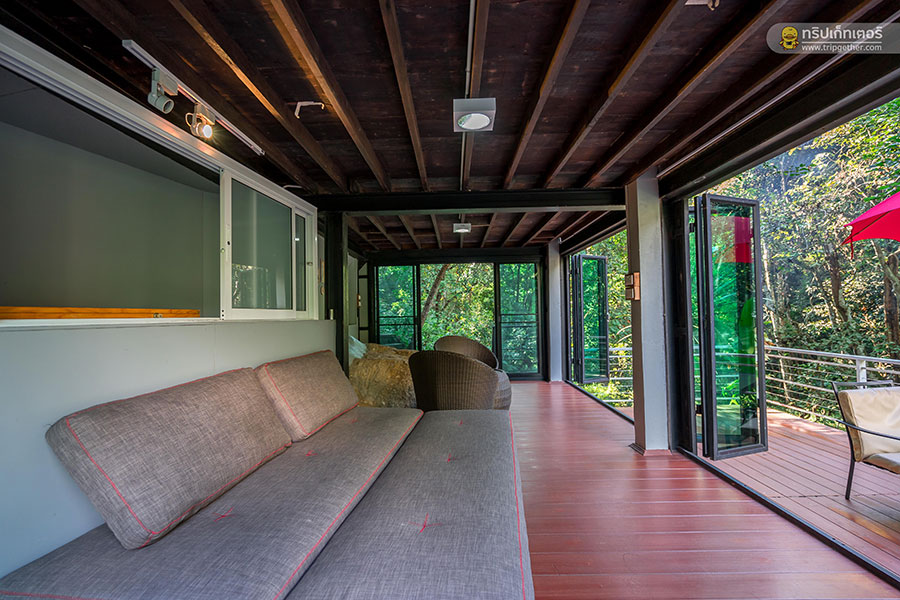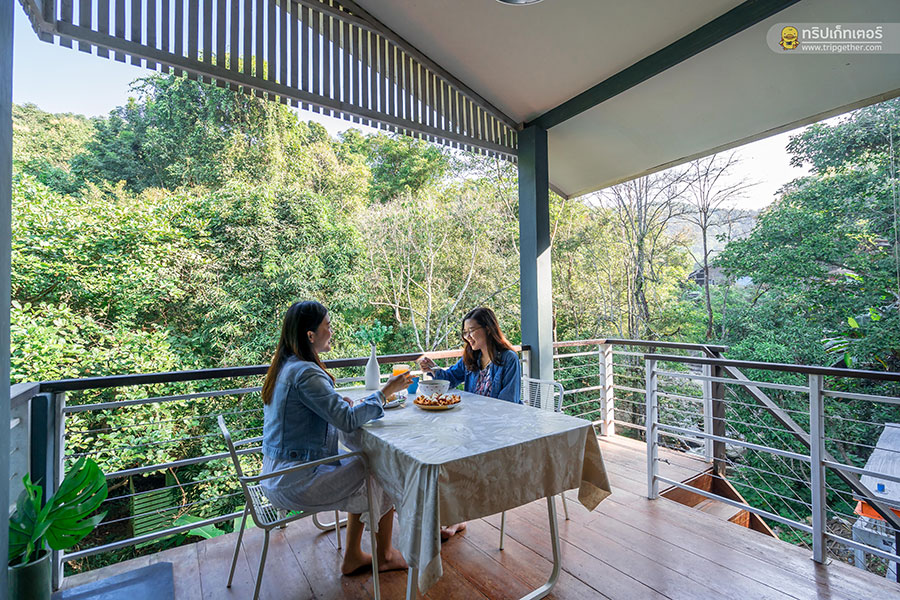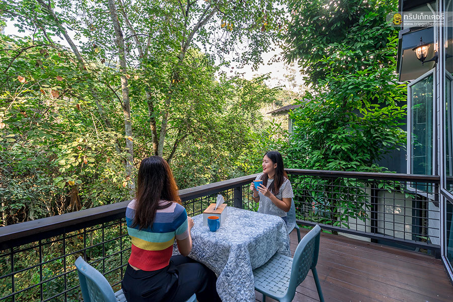 นอกจากนั้นยังมีระเบียงหน้าห้องสามารถออกไปนั่งรับประทานอาหาร หรือนั่งเมาท์มอยท่ามกลางบรรยากาศสุดร่มรื่นได้ตั้งแต่เช้ายันเย็น
