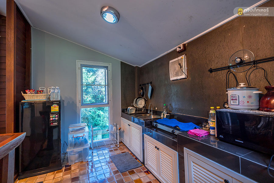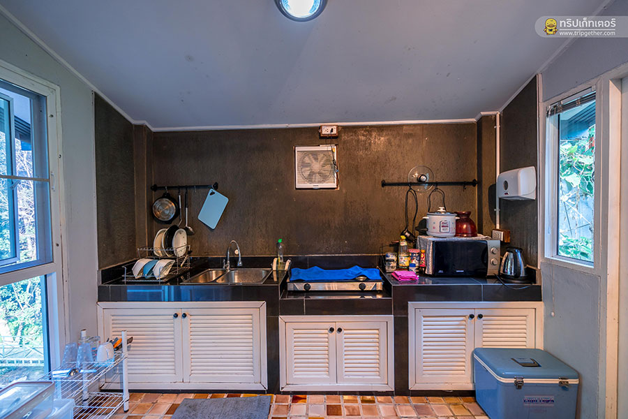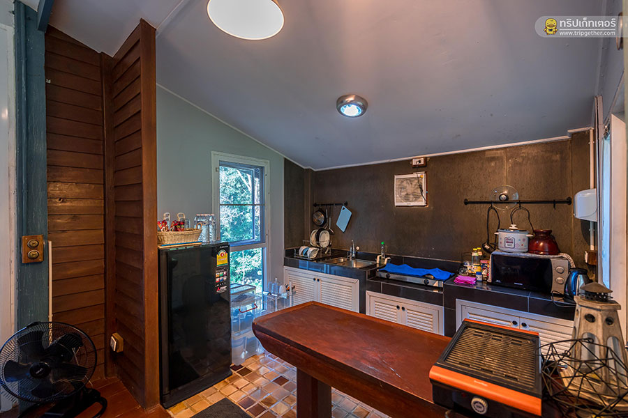 มีทั้งชุดเครื่องครัวแบบครบเซ็ต เตาแก๊ส ไมโครเวฟ กาต้มน้ำร้อน ตู้เย็น อ่างล้างจาน และอื่นๆ อีกมากมาย ซึ่งเราสามารถเตรียมวัตถุดิบมาทำอาหารสังสรรค์กันได้อย่างสะดวกสบาย หากใครเป็นสายปิ้งย่างที่นี่ก็มีเตาปิ้งย่างไฟฟ้าให้บริการอีกด้วย