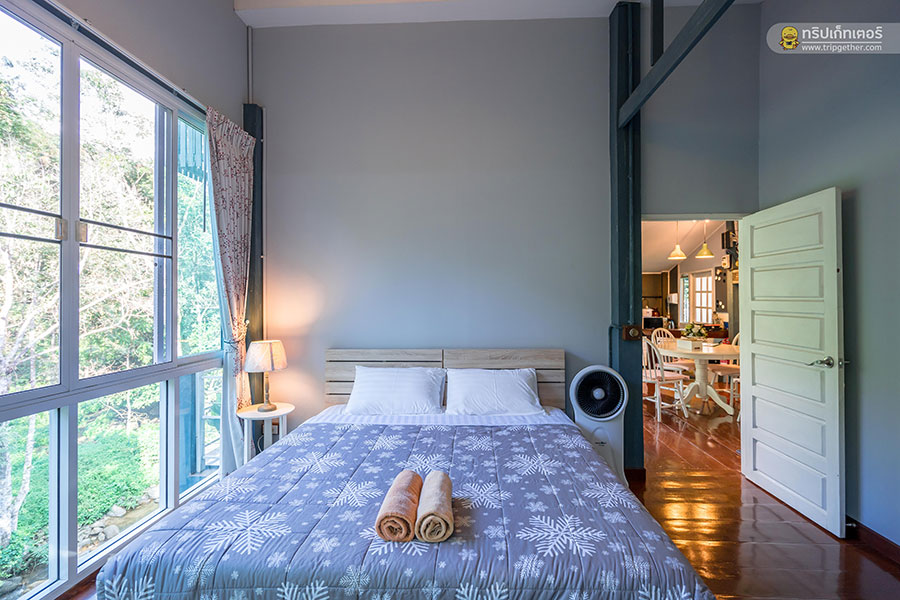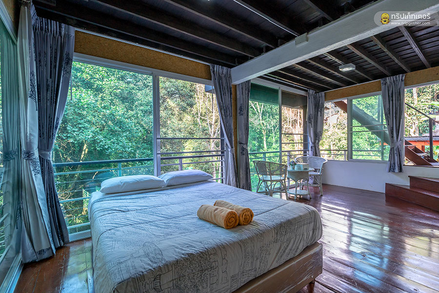 ถัดมาเป็นห้องนอนชั้น 2 รอบห้องติดหน้าต่างบานใหญ่เป็นกระจกใสสามารถเปิดเพื่อรับลมเย็นจากนอกห้องได้ ภายในห้องพักกว้างขวางมาพร้อมเตียงคิงไซส์หนานุ่มนอนหลับสบาย และมีชุดโต๊ะเล็กไว้นั่งเล่นกินลมชมวิวริมหน้าต่างบานใหญ่อีกด้วย