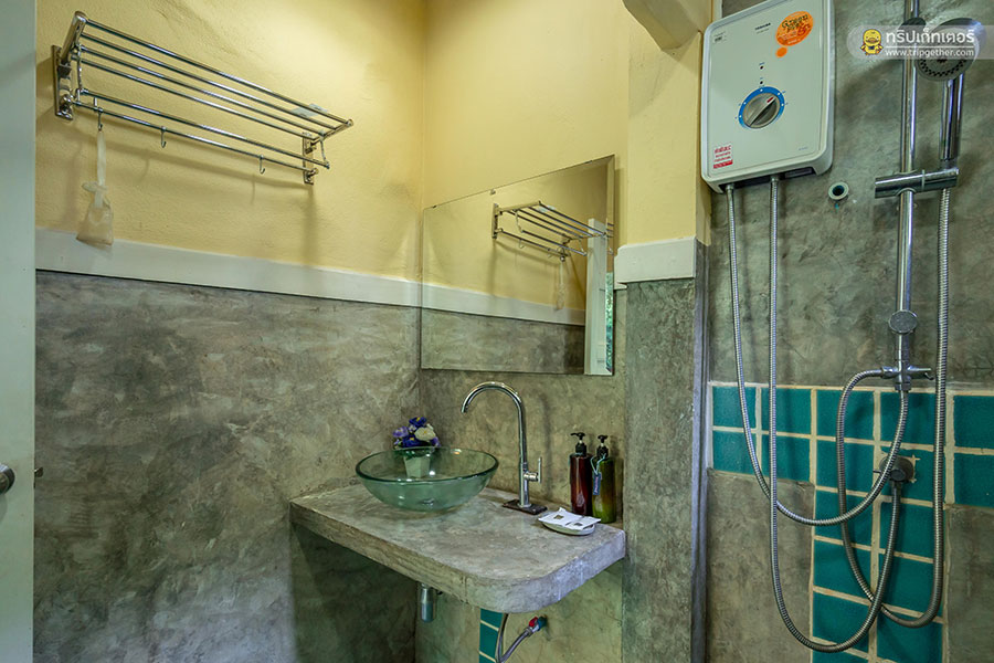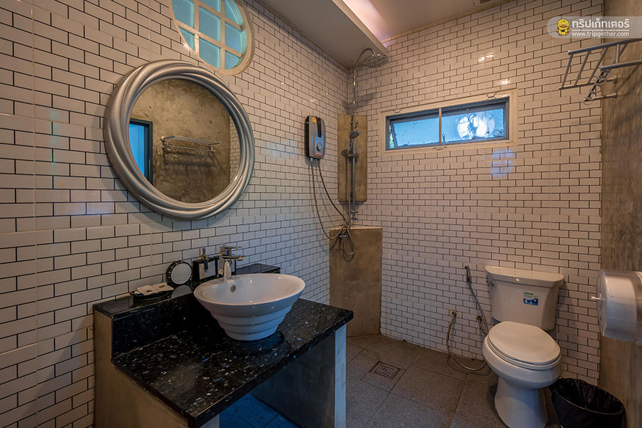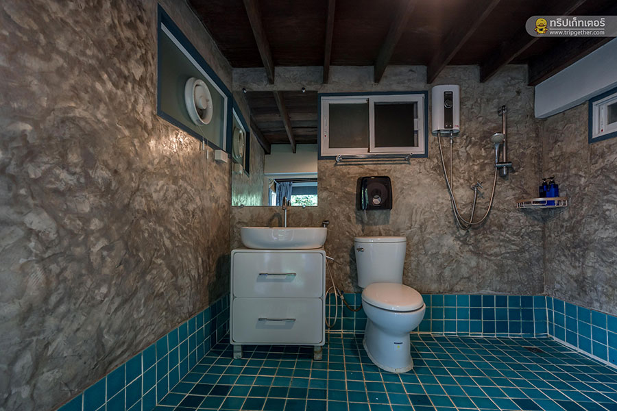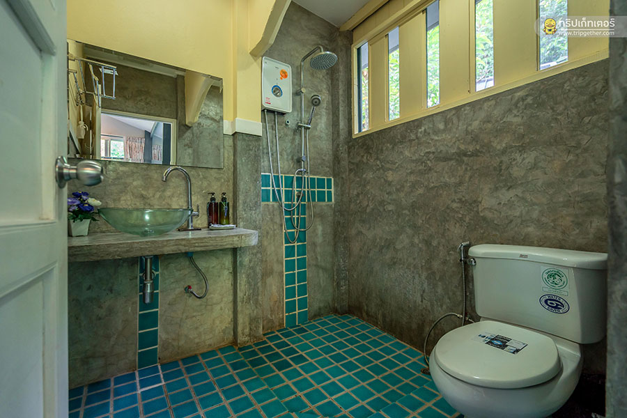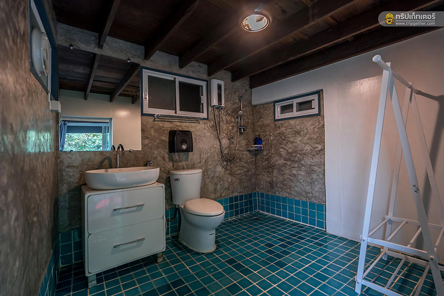 ห้องนอนนี้มีห้องน้ำในตัว ภายในตกแต่งด้วยกระเบื้องสีฟ้าอมเขียวให้ความรู้สึกสดชื่น มีพื้นที่ใช้สอยกว้างขวางสะดวกสบาย อีกทั้งยังมีสบู่ แชมพู เครื่องทำน้ำอุ่น และสิ่งอำนวยความสะดวกครบครัน