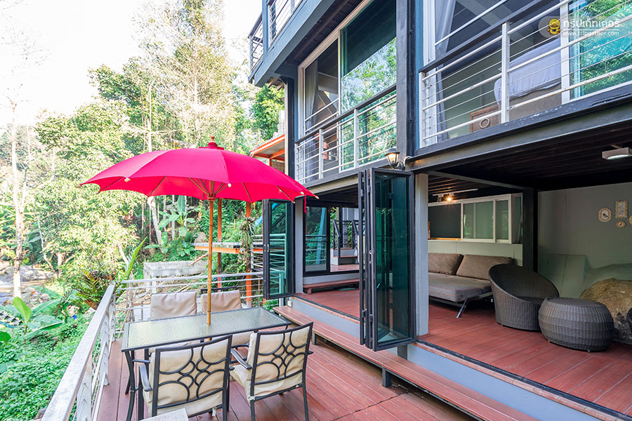 เมื่อเดินออกมาที่ระเบียงบ้านชั้น 1 จะได้ยินเสียงน้ำตกฟีลเหมือนมานั่งเล่นชิลล์ๆ ริมลำธารอย่างไงอย่างงั้น