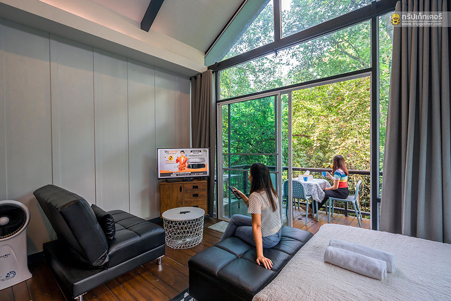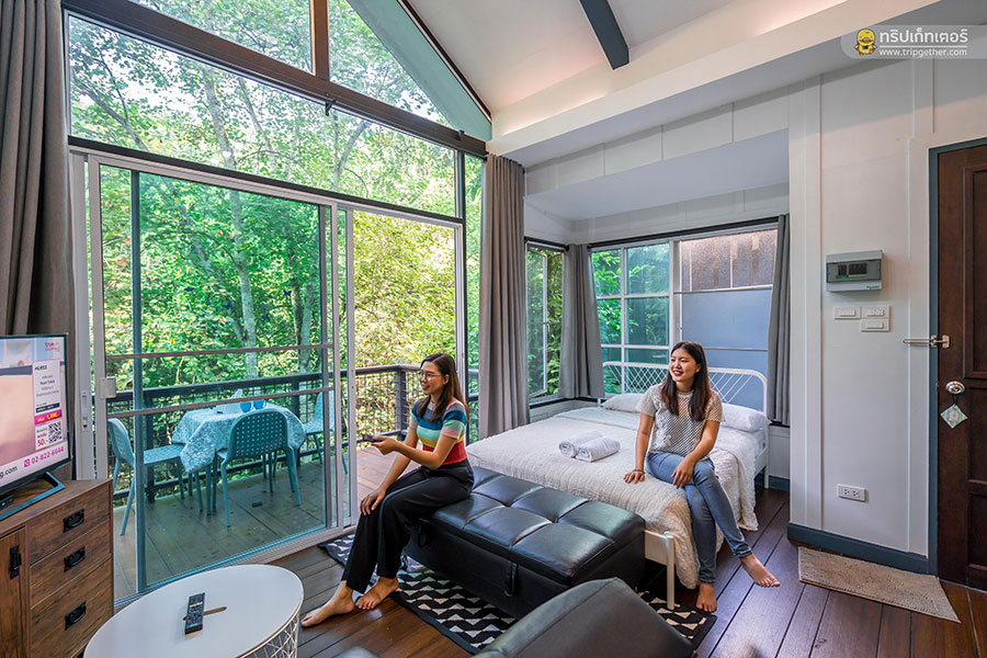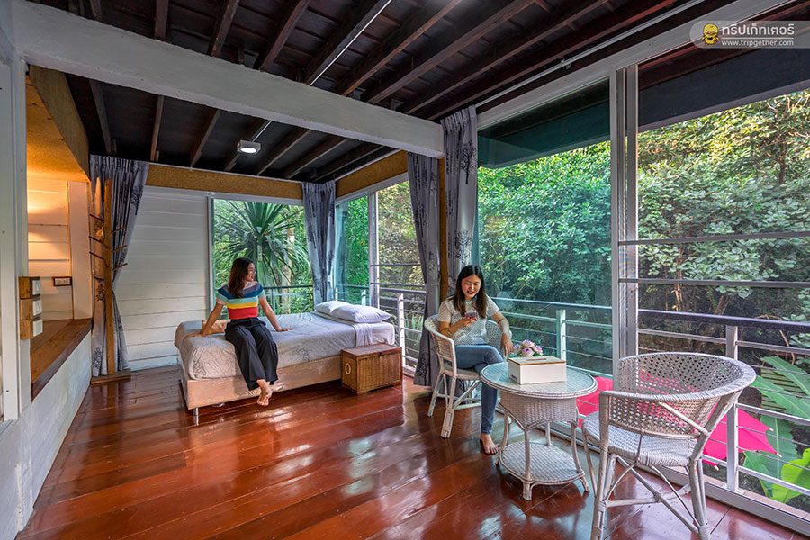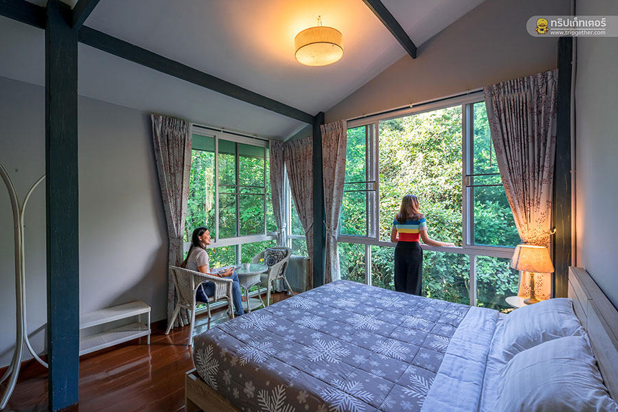 ห้องที่อยู่ถัดกันนั้นเป็นห้องนอนอยู่ฝั่งริมลำธารสุดกว้างขวาง มุมหนึ่งของห้องติดกระจกใสบานใหญ่ให้สามารถมองเห็นวิวสวยของธรรมชาติได้อย่างชัดเจน อีกทั้งยังได้ยินเสียงธารน้ำไหลฟินตลอดทั้งคืนอีกด้วย ภายในห้องพักตกแต่งเรียบง่ายด้วยเฟอร์นิเจอร์โทนสีอ่อนให้ความรู้สึกผ่อนคลายสบายตา