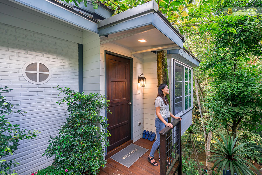 มาต่อกันที่บ้านหลังเล็กที่เมื่อก้าวเท้าเข้ามาภายในจะเจอกับเตียงคิงไซส์หนานุ่ม อีกทั้งยังมีโซฟาขนาดกำลังดีตั้งอยู่ตรงปลายเตียงสามารถนั่งชิลล์ดูทีวีเล่นมือถือสบายๆ ภายในห้องพักตกแต่งด้วยโทนสีขาวดำเรียบง่ายมาพร้อมกับประตูกระจกบานใหญ่สามารถมองเห็นวิวธรรมชาติอันเขียวขจี