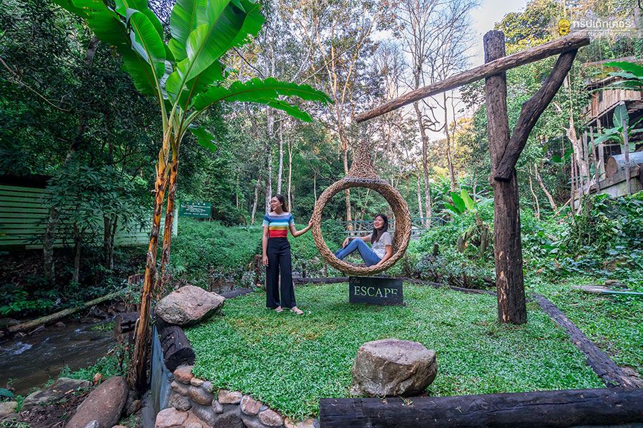 ตรงบริเวณหลังบ้านก็มีมุมชิงช้าบาหลีให้ลงไปนั่งชิลล์ ถ่ายรูปชิคๆ ริมธารน้ำไหล สวยไปอีกแบบ นอกจากนั้นยังมีชิงช้าและม้านั่งหินริมน้ำสามารถลงไปนั่งเล่นเอาเท้าจุ่มน้ำผ่อนคลายและชุ่มฉ่ำหัวใจไปกับธารน้ำใสท่ามกลางบรรยากาศสบายๆ รายล้อมไปด้วยธรรมชาติอันเขียวขจี