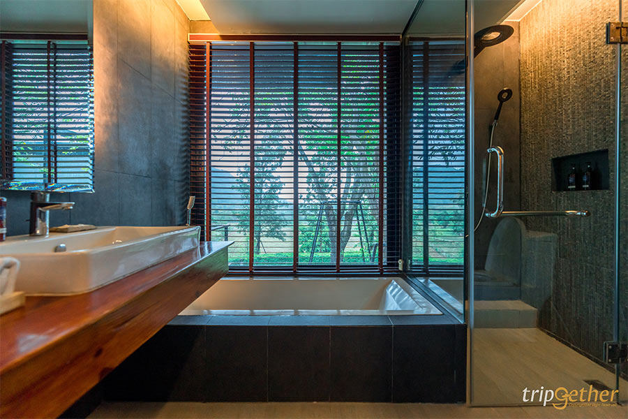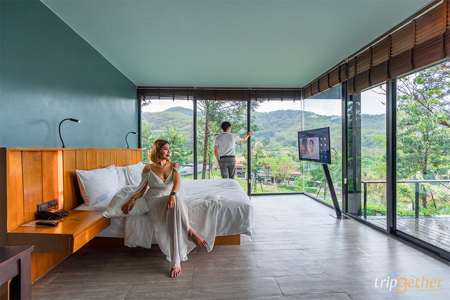 มาเริ่มกันที่ห้องพักของโรงแรมกันก่อนดีกว่า ที่นี่มีทั้งหมด 68 ห้อง แบ่งเป็น 5 แบบได้แก่ Spacious Deluxe, Scenery Villa, Horizon Villa, Jacuzzi Villa และ Pool Villa โดยมี Club House เป็นใจกลางอยู่บนยอดสูงสุด วันนี้เราจะมาแนะนำห้องพักไฮไลท์สองห้องด้วยกัน เริ่มจากห้อง Scenery Villa วิลล่าห้องกระจกแบบเป็นส่วนตัว เพราะถูกจัดวางให้ทุกหลังลดหลั่นกันตามแลนด์สเคปของเขา ทุกหลังจะมีระเบียงยื่นออกไปให้ชมวิว สูดโอโซนกันได้อย่างเต็มปอด มาพร้อมกับสิ่งอำนวยความสะดวกครบครัน ใครมาพักรับรองว่าได้ดื่มด่ำกับการพักผ่อนได้อย่างเต็มที่
