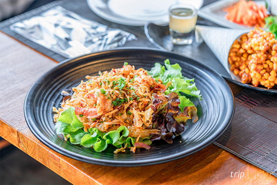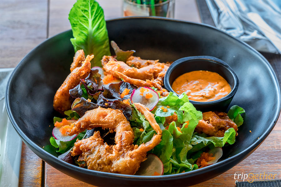มาเริ่มกันที่เมนู สลัดปูนิ่มสูตรพิเศษ สลัดปูนิ่มทอดกรอบมาพร้อมน้ำสลัดสูตรพิเศษที่ใช้ ซอสศรีราชาผสมกับมายองเนส ให้รสชาติหวานมันเผ็ดแบบลงตัว